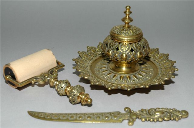 Parure en bronze doré composée d'un buvard rouleau, d'un coupe papier et d'un encrier forme d'un calice à corps ciselé et ajouré, fermé par un couvercle charnière sur un godet porcelaine et fixé au centre d'un plateau circulaire à bords festonnés, circa fin 19ème. Diam. 20, haut. 14 cm.