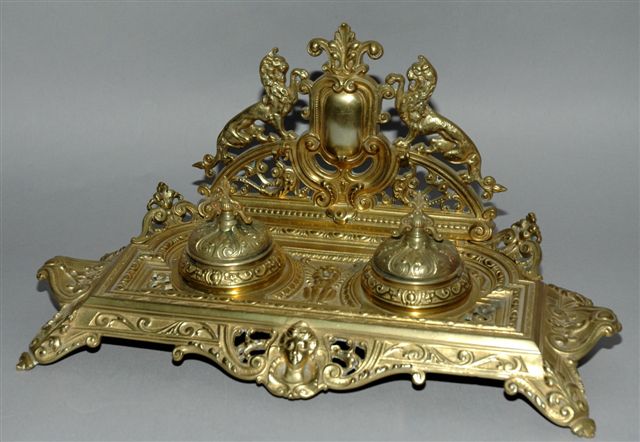 Écritoire en bronze doré type " Encrier Louis XIV " (attribué à Japy?), à deux encriers couverts sur plateau plumier rectangulaire en avant d'un dosseret à décor de deux lions encadrant un écu destiné à recevoir un chiffre ou monogramme et offrant deux ergots pique plume, circa fin 19ème. Monogramme: A D. Long. 37, larg. 22 cm.