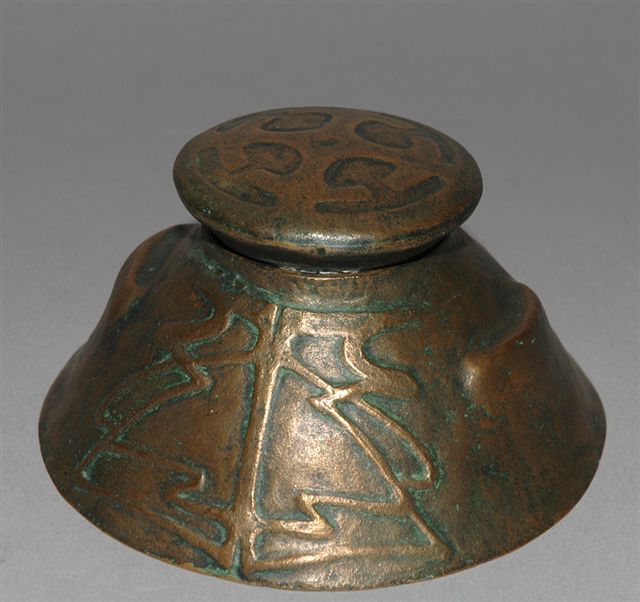 Encrier Art Déco en bronze à patine cuivrée en forme de cône tronqué à couvercle charnière pour un godet encrier, circa 1920. Diam. 17, haut. 10 cm.