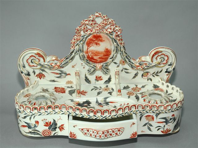 Écritoire de forme buffet à fronton pour deux godets encriers et un tiroir rangement dans la base. Le décor pourpre et gris est à motif floral et d'oiseaux sur toutes les parties. Le dosseret présente en son centre un médaillon enrubanné à décor champêtre pourpre. Les bordures sont surlignées de pourpre, gris et or. Signature à la croix de Lorraine encrée rouge: GALLE et NANCY, circa 1879-1889. (30cm ; 20cm ; 21cm) ; (reproduit p. 95 ref. f 043)
