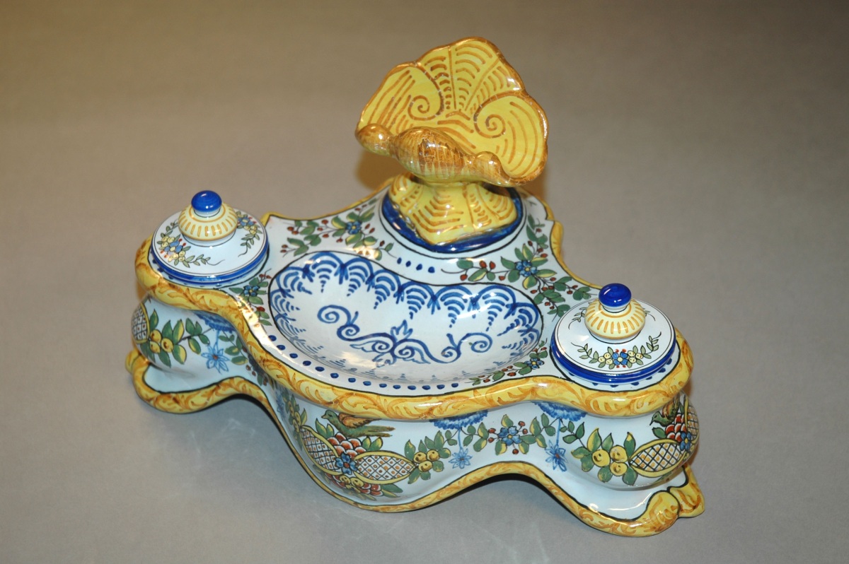 Très rare écritoire terrasse rocaille modèle aux paniers fleuris. Deux godets encriers couverts sur une terrasse portant en son milieu une structure repose plume en forme de champignon de couleur ocre. Signature A M pour ANTOINE MONTAGNON et noeud vert, circa 1875 / 1889. (24,5 / 17 / 18cm)