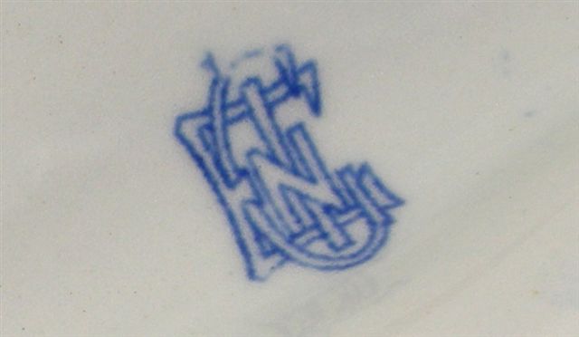 Écritoire aux "Têtes de lion" pour trois godets encriers couverts, décor Rouen bleu. Marque GIEN lettres entremêlées, circa 1871 à 1876. (38cm / 20cm / 9cm)