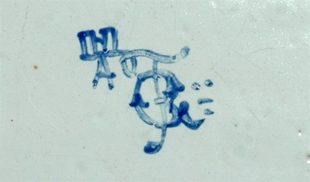 Écritoire forme coquille ovale à décor floral dans la partie plumier à marli peigné bleu pour deux godets encriers avec petits bouchons à prises coquilles. Marque (encrée bleu) le Château et A (pour Angoulême) et monogramme FG en cursives entrelacées pour F Goras: circa 1880 - 1890. (22cm ; 15cm ; 7cm), (petites égrenures)