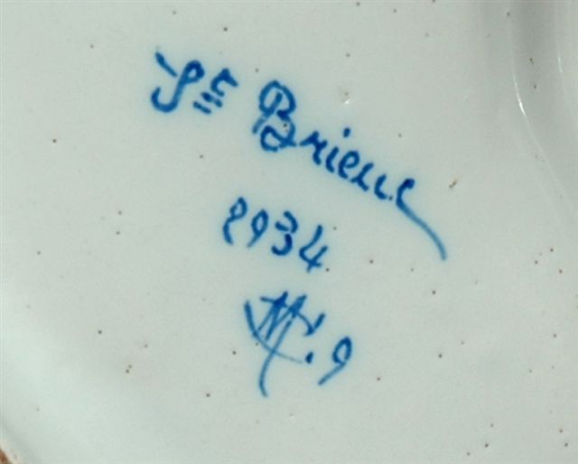 Écritoire forme plumier à plateau trilobé en avant d'une petite terrasse portant trois godets dont deux encriers couverts et le plus petit pour les plumes. Le décor en polychromie de Desvres mélangeant les motifs de Rouen et Quimper avec en plus les armoiries de la ville de St Brieuc. Signature GM pour Géo Martel, circa 1900 / 1924.