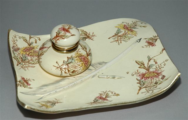Encrier en faïence d'un flacon forme lentille à bouchon boule sertissage laiton doré posé sur un plateau plumier rectangulaire de la forme d'un parchemin. Il est à décor de chrysanthèmes, d'une plume d'oie et un embout de plume. Un filet or souligne la bordure du plumier.