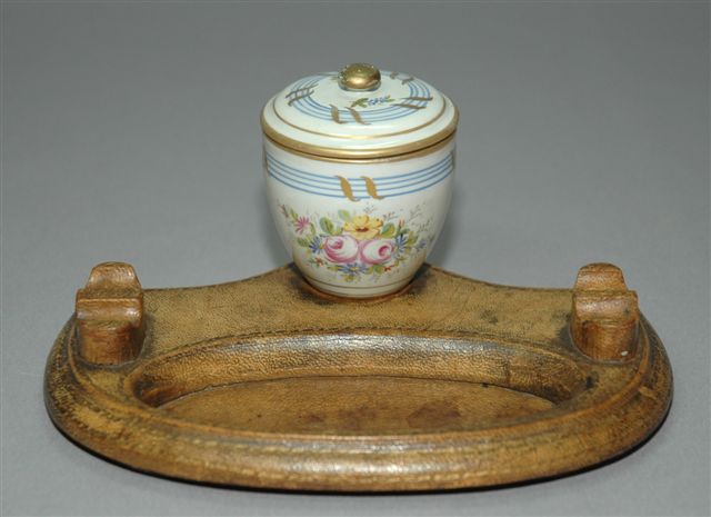 Encrier en porcelaine forme de vase couvert sur plateau habillé de cuir. Le porte godet encrier est placé en arrière du réceptacle plumier et des ergots repose porte plume. Le décor est floral avec des roses mousses. Marque de Sèvres Maison Royale, époque début XIXème. Long. 20, larg. 14, haut. 10 cm.