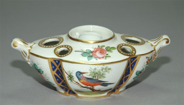 Encrier en porcelaine forme navette à deux prises latérales, pour un godet encrier et cinq réceptacles dont trois trous pique plume et deux plus larges pour un sceau et un bâton de cire. Le décor est fait de roses mousses et d'oiseaux avec des rehauts d'or sur fond bleu et blanc. Marque de Sèvres, époque fin XIXème. Long. 16, larg. 9, haut. 6 cm.