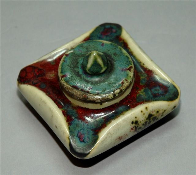 Encrier Art Nouveau en grès, forme d'un petit flacon carré aux bords relevés pour un godet encrier centré, avec son bouchon. Le décor est typique par l'émaillage particulier de ce céramiste avec son célèbre coloris sang de boeuf, avec ici du gris et du vert. Signature au stylet en creux DALPAYRAT et n°71, vers 1889-1899.(8cm ; 8cm ; 6cm) (bouchon recollé).