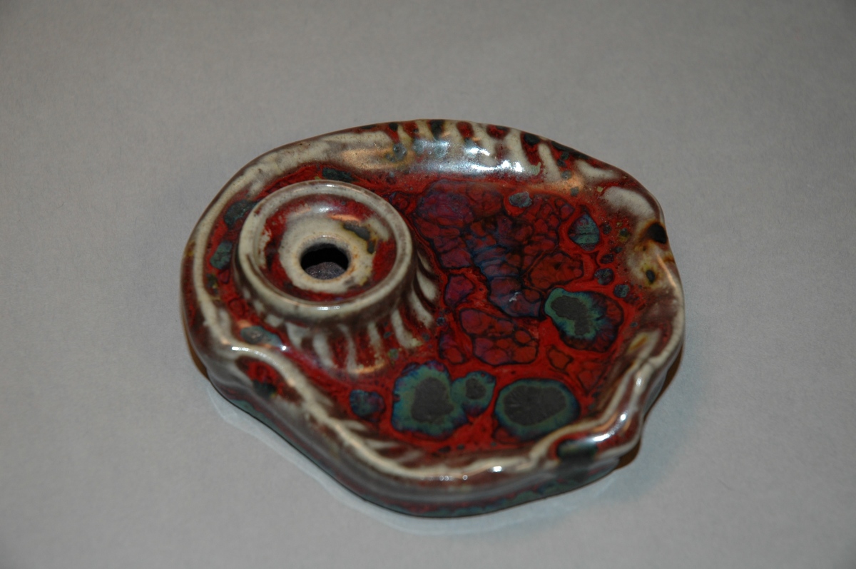 Encrier Art Nouveau en grès, forme mouvementée bords relevés pour un godet encrier excentré. Le décor est typique par l'émaillage particulier de ce céramiste avec son célèbre coloris sang de boeuf, ici avec un bleu / vert.