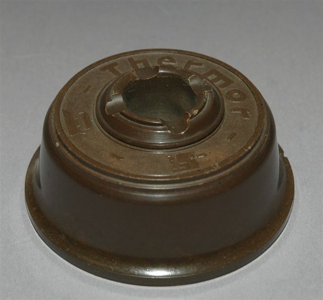 Encrier en bakélite de couleur brune pour les appareils électriques de chauffage et de ménage de la marque THERMOR, forme conique et encoche porte plume. Début 20ème. Diam. 9, haut. 4 cm.