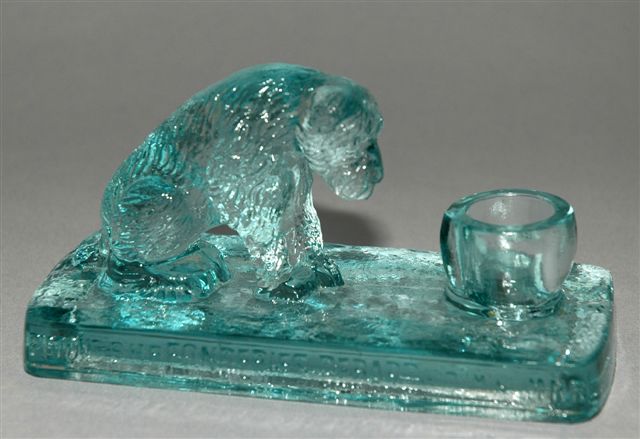 Encrier sur terrasse en verre moulé bleu translucide au motif animalier (chien assis devant un récipient qui sert de godet encrier pour " PISTONS BHB FONDERIES DEBARD HIDUMINIUM RR ".