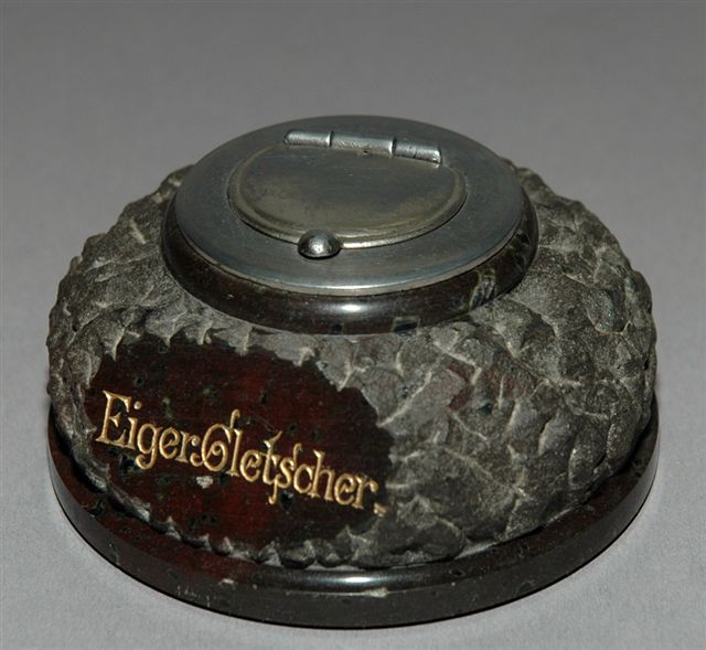 Encrier en éclat de pierre brune taillée en cristaux. Le godet encrier en étain est serti au centre du support avec un couvercle charnière. Support publicitaire pour le tourisme Suisse portant la mention EIGER GLETSCHER (GLACIER DE L'EIGER). Diam. 10, haut. 5 cm.