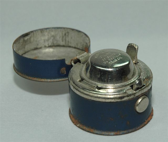 Encrier de voyage publicitaire dans un étui de forme cylindrique en métal peint en bleu portant sur le couvercle la pub " Véritable Grains de Santé du Docteur Franck ", et au revers " Hotel Richelieu vis à vis La Rue D'Antin "Le couvercle est à charnière avec ouverture par bouton poussoir. L'intérieur recèle le flacon encrier cylindrique en verre obturé par un fermoir bouchon à système de cliquet. Fin XIXème. Diam. 4, haut. 3 cm.