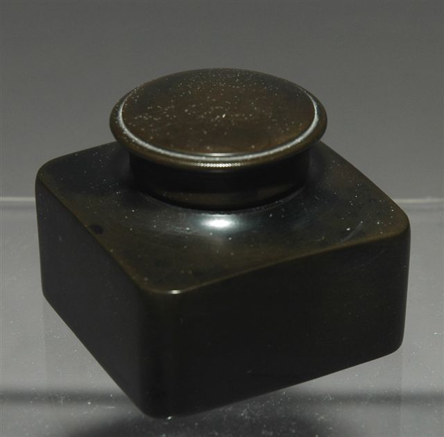 Encrier de voyage, composé d'un flacon cubique en bakélite noir à double bouchon vissé. début 20ème. Larg. 5, haut. 4 cm.