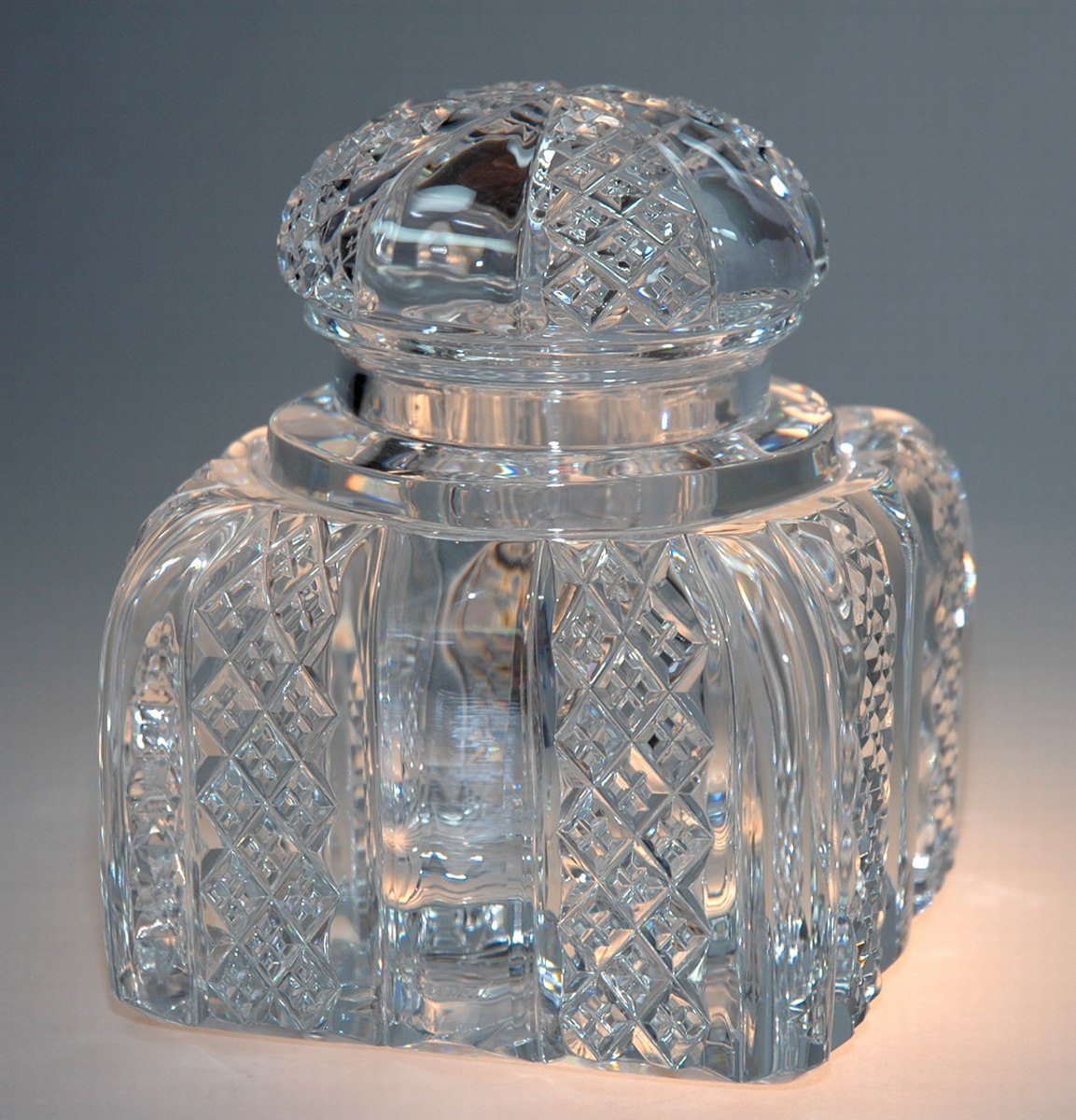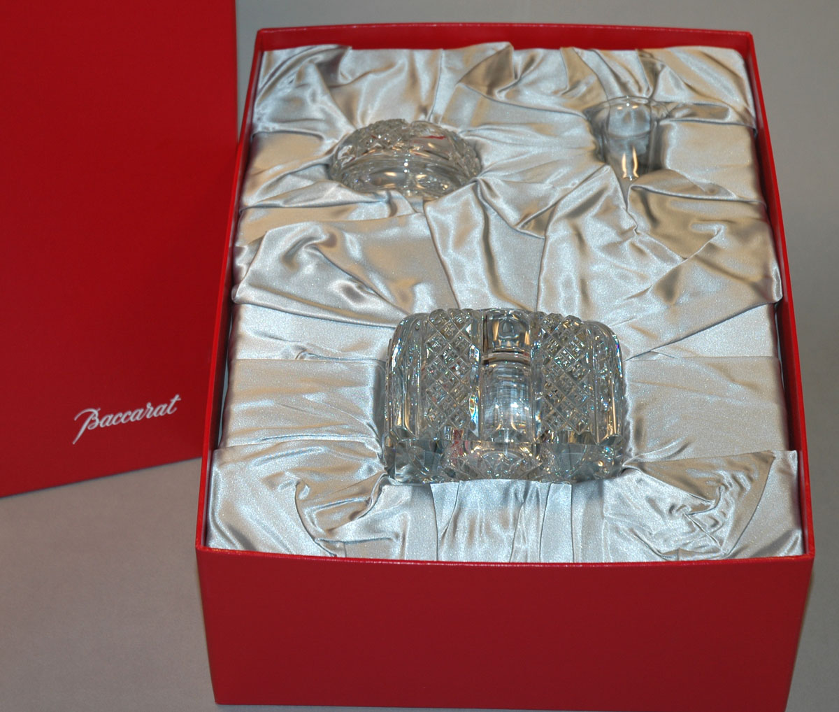 Encrier en cristal de Baccarat modèle ÉMILE ZOLA, d'une édition à tirage limité à 300, ici l'exemplaire n° 204 / 300. De forme cubique avec un bouchon couvrant le godet en cristal. Son décor alterne des bandes pointes de diamant avec des bandes sans motif. Gravage en lettres anglaises Baccarat et n° de l'exemplaire à la base d'une des faces et marque en rond gravé à l'acide au centre du revers. XXème. Présenté avec son coffret d'origine et son certificat. Larg. 12 , haut. 15 cm.