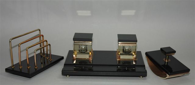 Parure de bureau en pâte de verre noire composée d'un plateau portant deux porte godets encriers cubiques en cristal, fermés par couvercles noirs à charnière, d'un tampon buvard et d'un range lettre, assortis. Début XXème. Long.26, 5, larg.19, haut.10 cm.