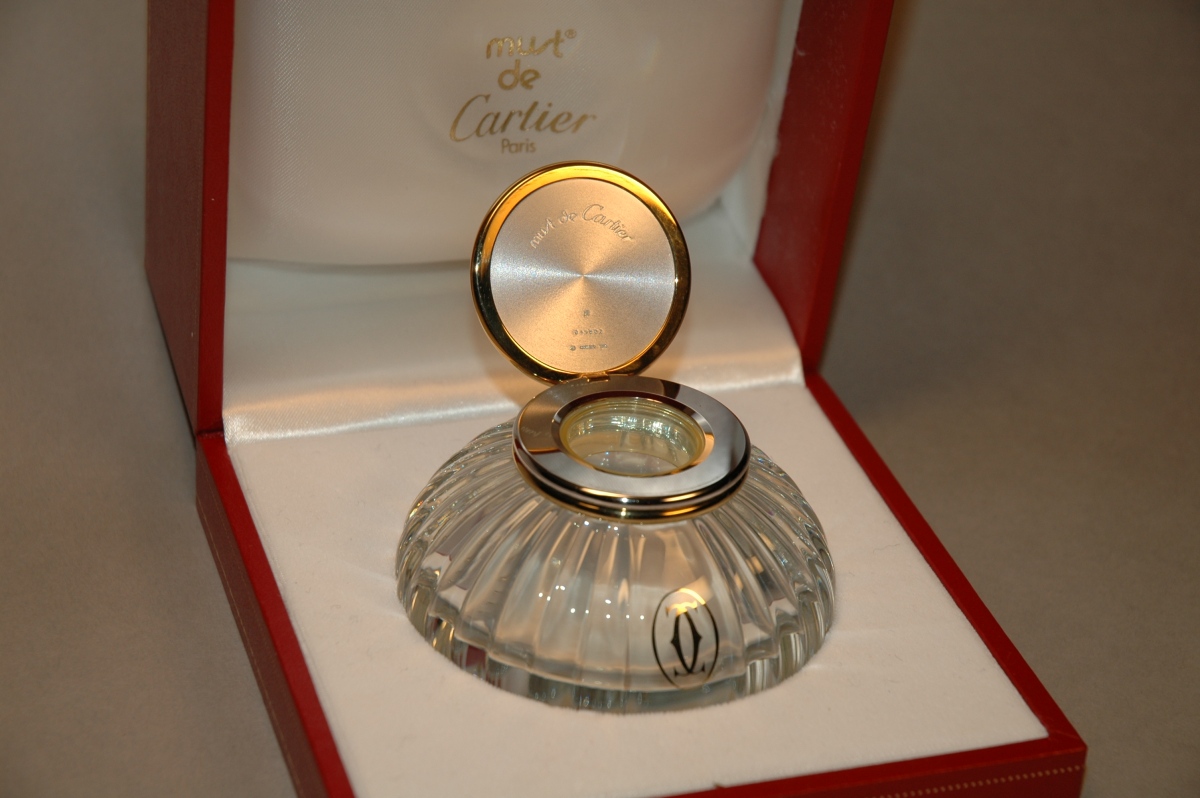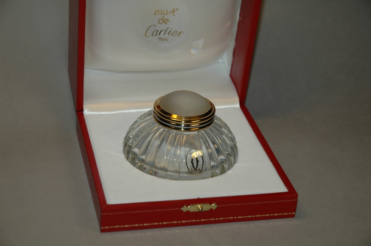 Encrier Must de Cartier en cristal soufflé de forme lentille à décor godron, bouchon cristal finition sablé sertissage au trois anneaux symbole Cartier Il porte la marque Cartier et gravée à l'intérieur du bouchon son n° 011603. An 1993.