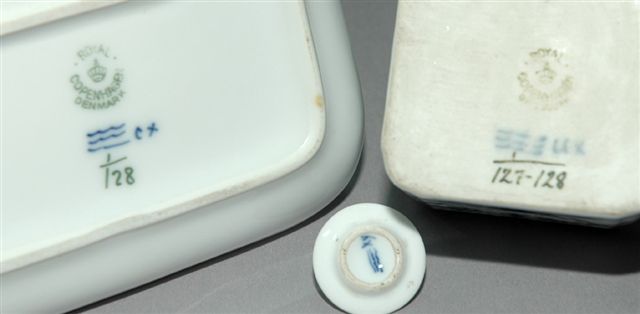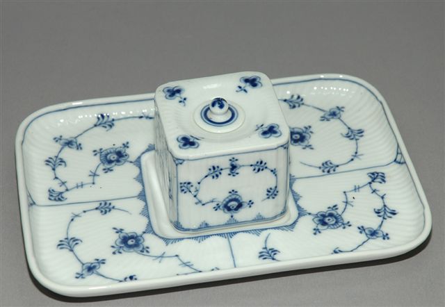 Encrier cubique amovible avec petit bouchon en porcelaine dure placé au centre d'un plateau plumier rectangulaire à décor de fleurs et rameaux en bleu. Marque de la manufacture ROYAL COPENHAGUE DENMARK au revers des trois pièces. Circa XIXème. Long. 22, larg. 15,5, haut. 8 cm. (reproduit p. 124 ref. p 008)