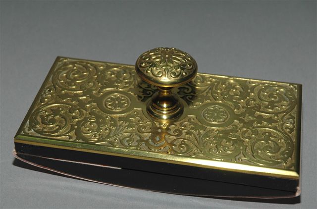 Buvard Tampon base bois, plaque décorative et prise bouton en bronze doré au décor de style Renaissance.