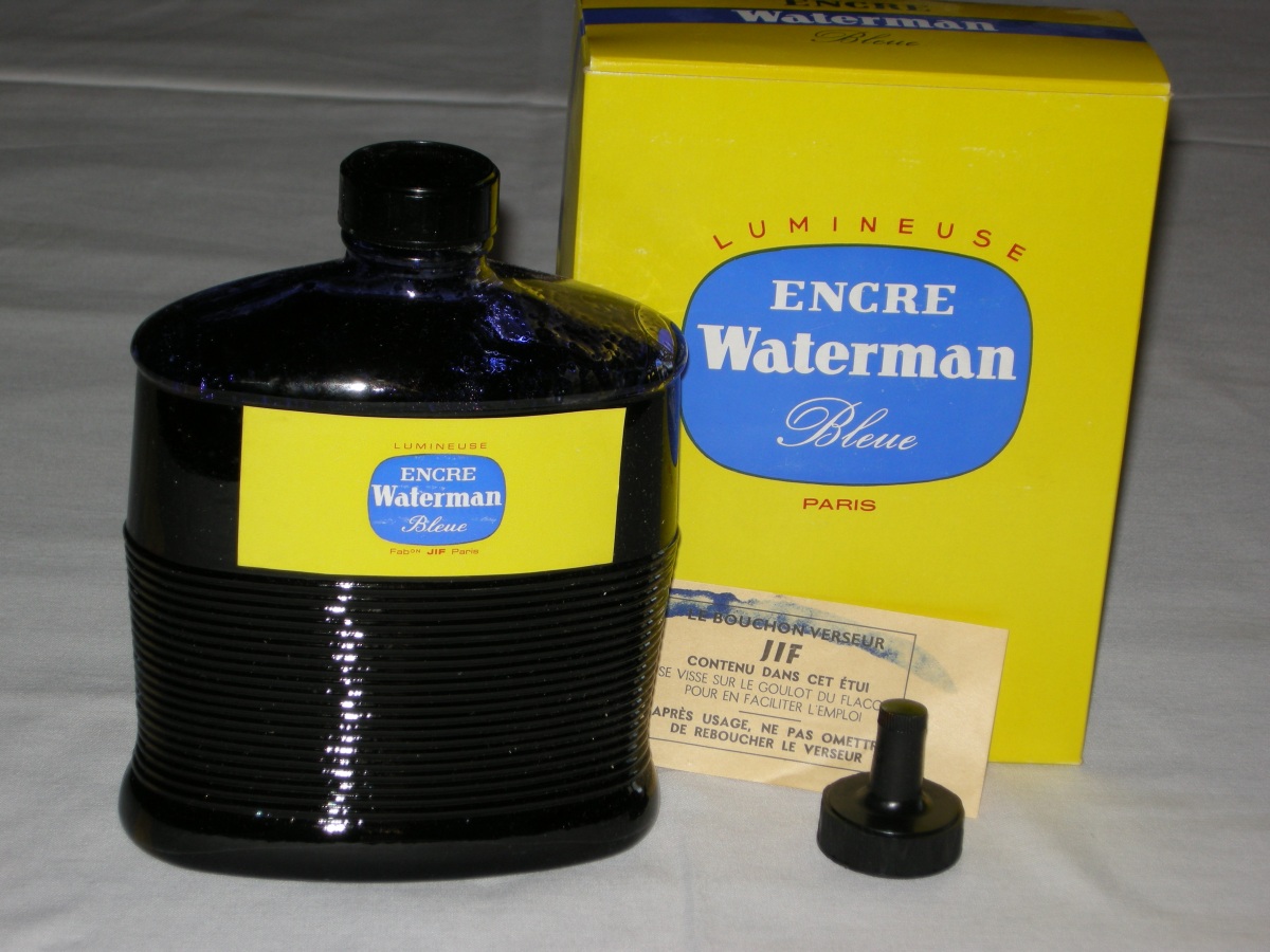 Marquage par étiquette: Lumineuse Encre WATERMAN Bleue. Marquage en relief dessous " WATERMAN Made in France Déposé " et sur le bouchon " WATERMAN ", XXème. (état neuf, jamais servi).