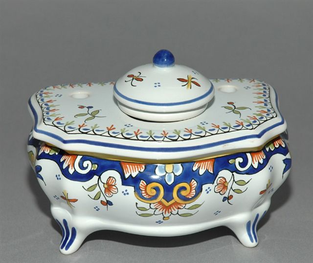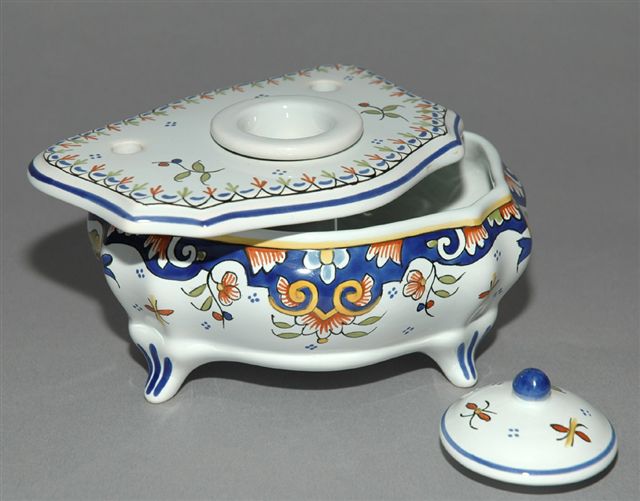 Encrier forme commode au décor de Rouen et liseré bleu, pour un godet encrier avec bouchon à prise bouton et deux trous pique plumes. Le plateau amovible recèle une boîte de rangement. Fabrique Fourmaintraux-Dutertre à Desvres.