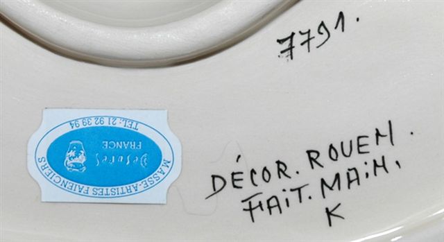 Encrier plumier forme rocaille au décor de Rouen et liseré bleu, pour un godet encrier avec bouchon à prise bouton.