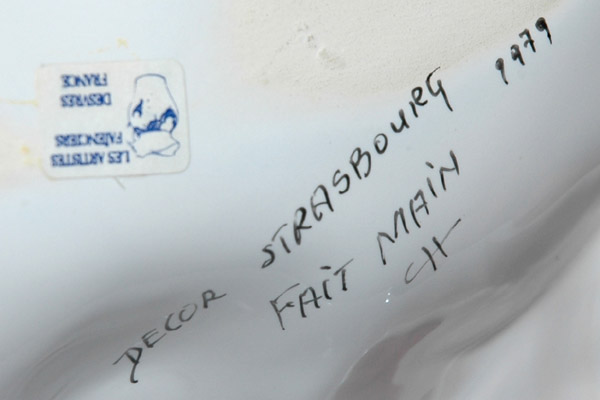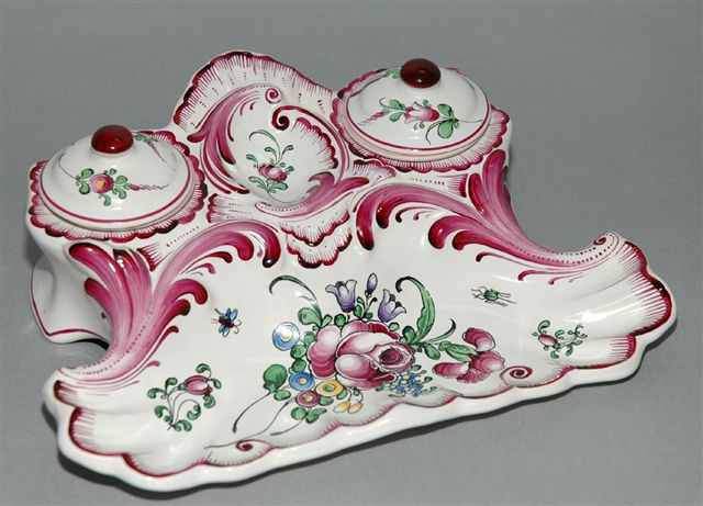 Ecritoire plumier forme rocaille au décor de Strasbourg avec palmettes et coquilles au marli pourpre, pour deux godets encriers avec bouchons à prise bouton sur terrasse dosseret.