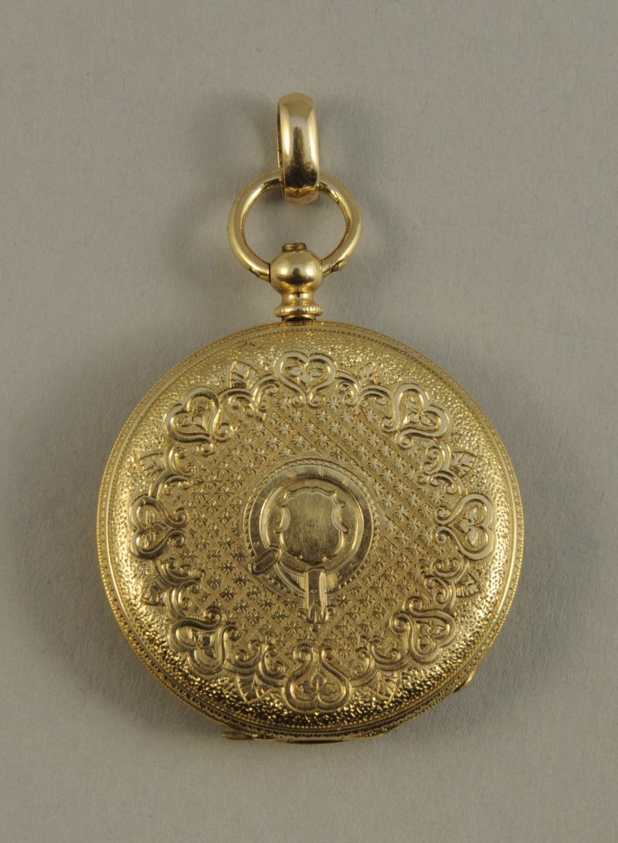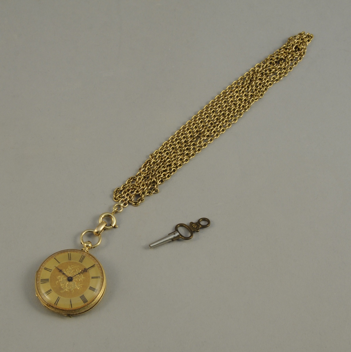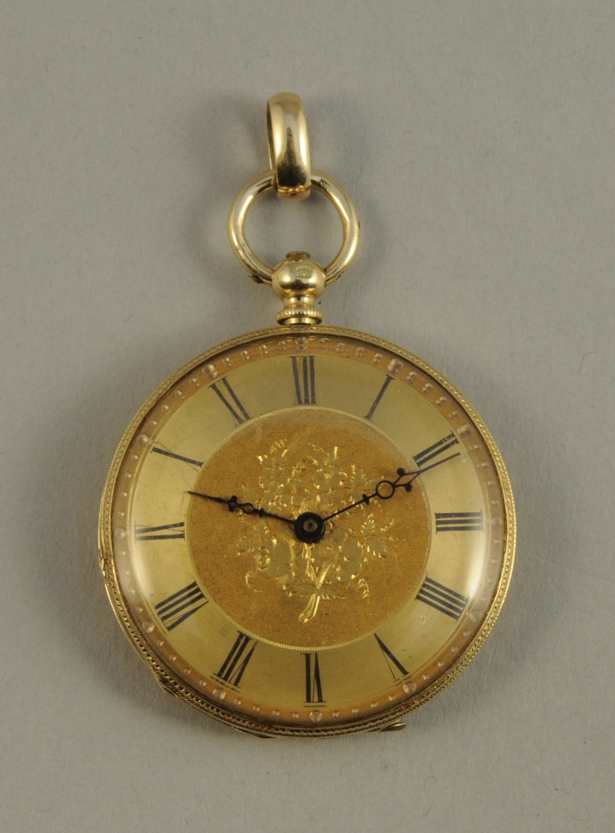 MONTRE de dame à clef à remontage par le fond en or jaune guilloché, cadran doré à chiffres romains.