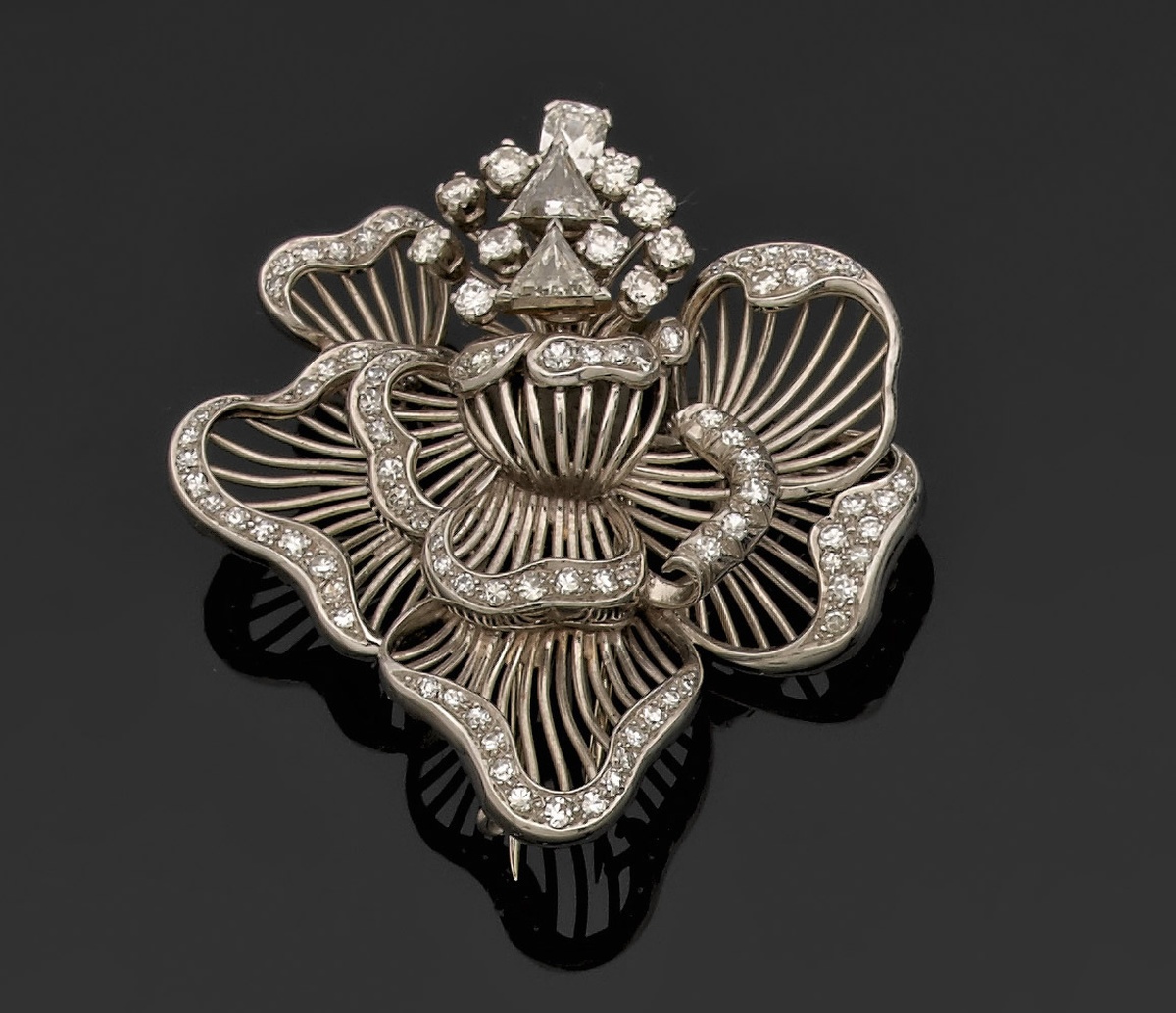 BROCHE représentant un vase fleuri dans un décor en forme de volute en platine ajouré sertie de diamants ronds, deux d'entre eux taillés en triangle.