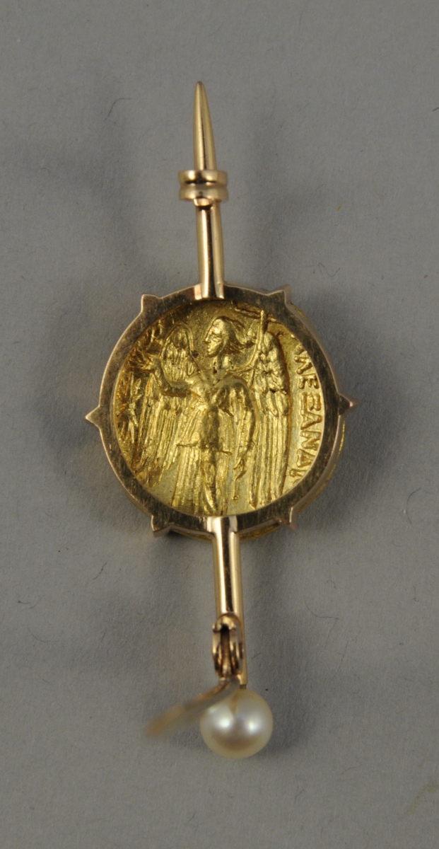 STATÈRE en or d'ALEXANDRE LE GRAND monté en épingle à cravate elle-même ornée d'une perle. Poids brut: 13 g.