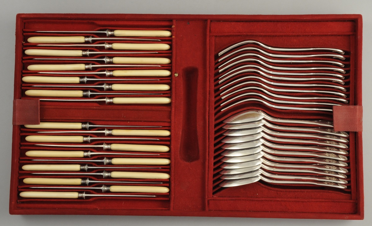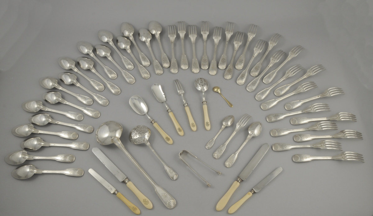 Importante MÉNAGÈRE de 161 pièces monogrammée, modèle filet coquille de style Louis XV en argent comprenant: 18 couverts de table, cuillères et fourchettes, 18 fourchettes de table, 36 couteaux manche ivoire, 12 couverts à desserts, cuillères et fourchettes, 12 petits couteaux lame acier manche ivoire, 12 couteaux à fruit lame argent manche ivoire, 10 cuillères à café, six pelles à sel en vermeil, une pince à sucre, une saupoudreuse et une louche, quatre couverts à entremets manche ivoire.