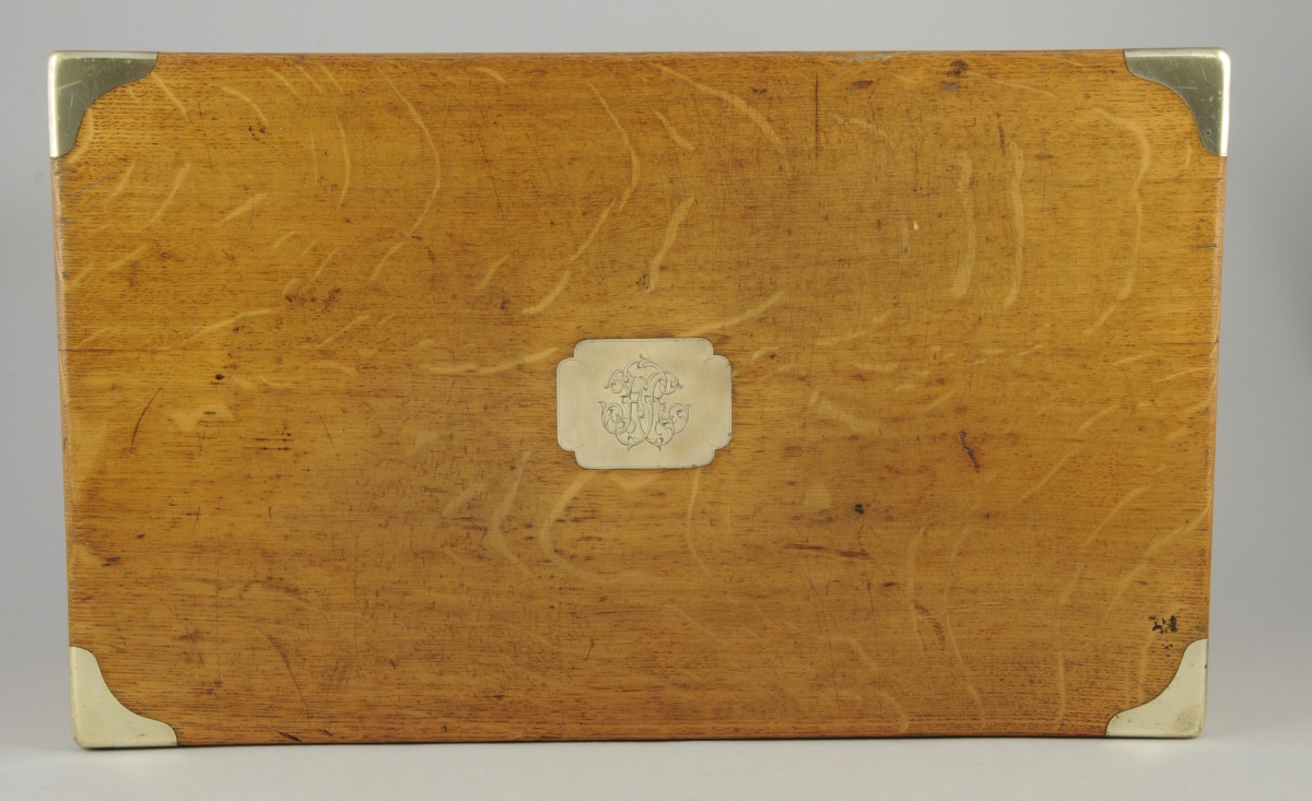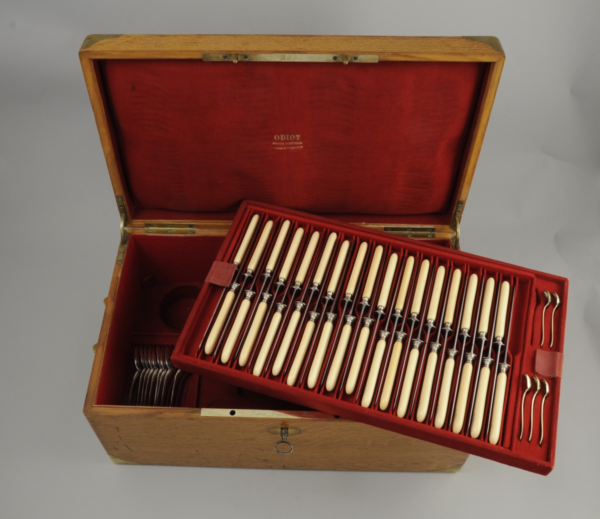 Dans un coffret en chêne foncé de velours cramoisi, à renforts et poignée de laiton, chiffré sur un cartouche et signé sur la serrure: "Odiot Orfèvre à Paris".