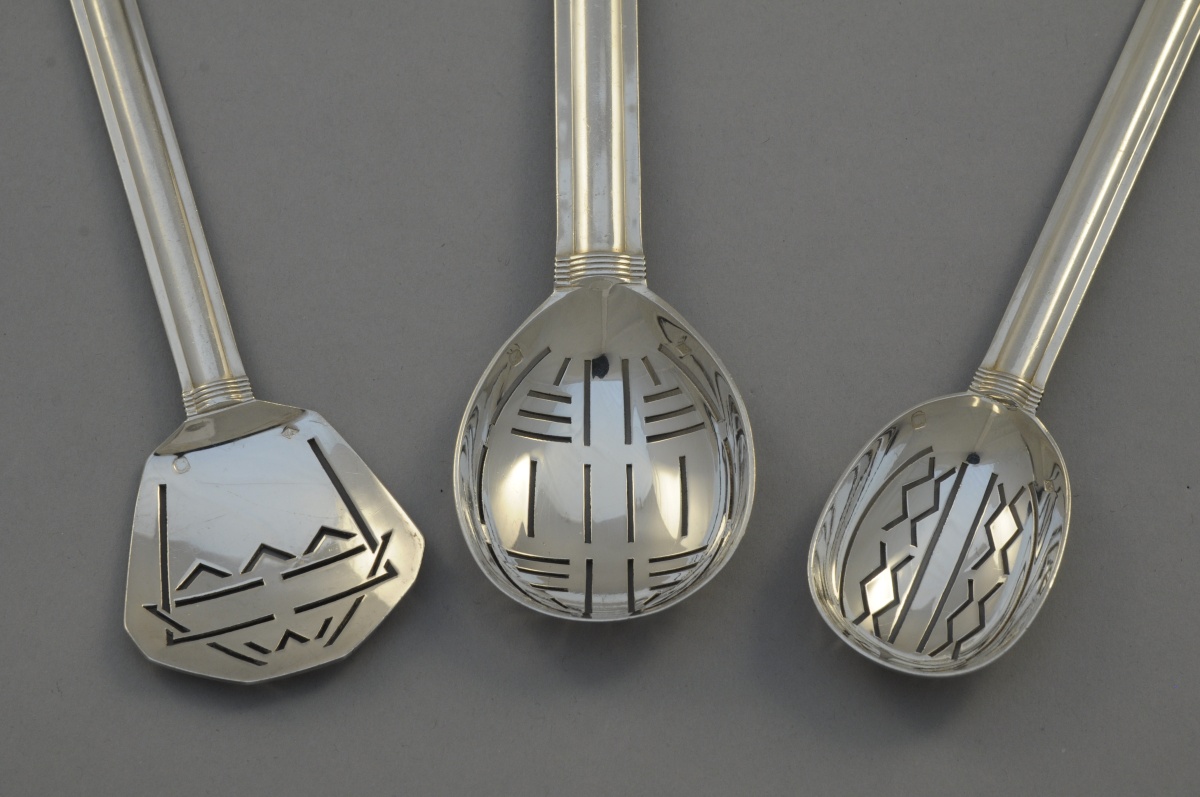 Importante ménagère en argent de 145 pièces, modèle Cannes, 1928, comprenant: 12 couverts de table, 12 couverts à dessert, 12 couverts à poisson, 9 plus 3 fourchettes à gâteau, 12 cuillères à café, 12 cuillères à glace, 1 cuillère à sauce filtrante, 1 cuillère à servir, 1 cuillère bombée, 1 couvert à salade, 1 pelle à glace, 1 pelle à gâteau repercée, 1 couvert à hors-d'oeuvre, 1 couteau à cocktail, 1 fouchette à cocktail, 1 cuillère à coktail repercée, 1 pelle à cocktail repercée, 12 grands couteaux, 12 petits couteaux.
