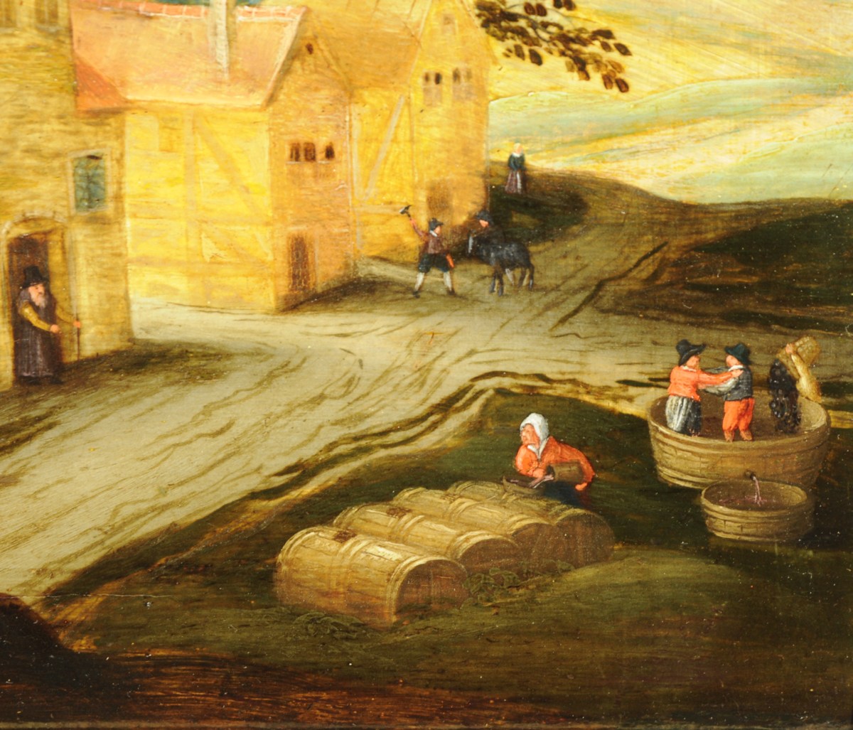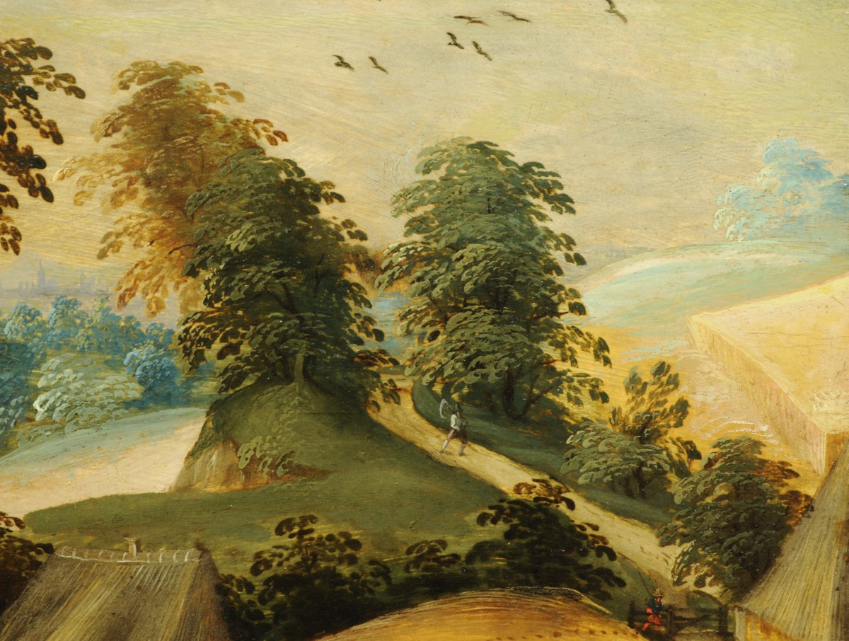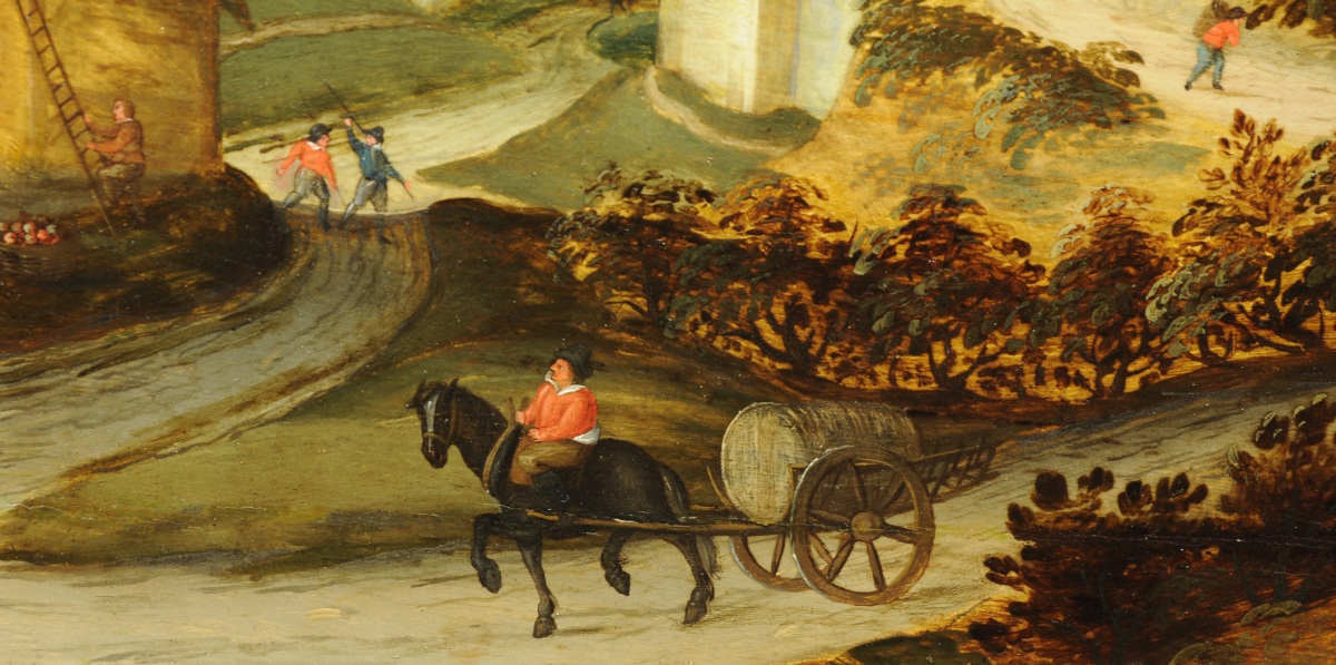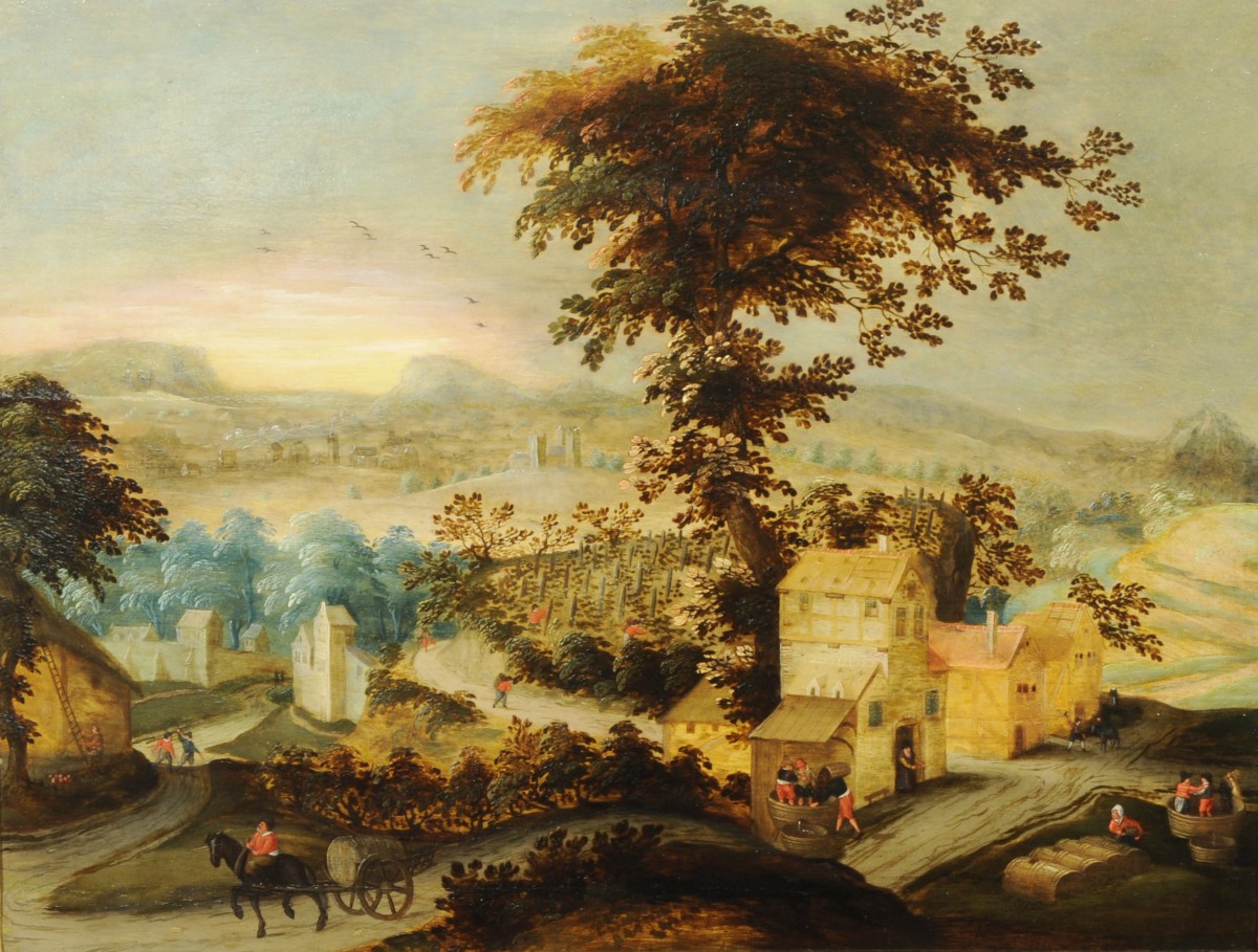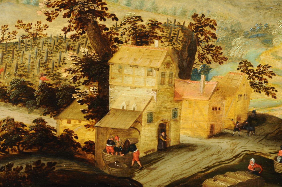 Peintre anversois connu pour ses scènes champêtres, Abel Grimmer inscrit sa peinture dans la droite lignée des primitifs flamands. Fils du paysagiste Jacob Grimmer, il est reçu Maître de la Guilde de Saint-Luc en 1592. Il réalise, cette même année, son chef d'uvre des douze mois pour la chapelle Notre-Dame de Montfaucon-en-Velay. Les activités saisonnières de l'homme sont le cadre, dans des paysages en mouvement de paraboles christiques. Il puise son inspiration dans les gravures de Bruegel et d'Hans Bol. Les Saisons et les Mois de l'année sont l'un de ses thèmes les plus répandus dans les musées et collections privées. Abel Grimmer partage, avec son père, la schématisation des figures et des paysages, l'harmonie des couleurs à partir d'une palette douce et une composition linéaire. Le rendu méticuleux des architectures et des perspectives distingue l'uvre du fils de celle du père. Abel a en effet suivi une formation d'architecte dans sa jeunesse. Ses recherches sur ce thème inspirent une nouvelle génération de peintres comme Pieter Saenredam, célèbre pour ses intérieurs d'églises. Charmante, naïve et subtile, l'uvre de Grimmer fils puise ses qualités dans les fondements de la peinture flamande. Elle marque un tournant vers le XVIIème siècle, le Siècle d'Or.