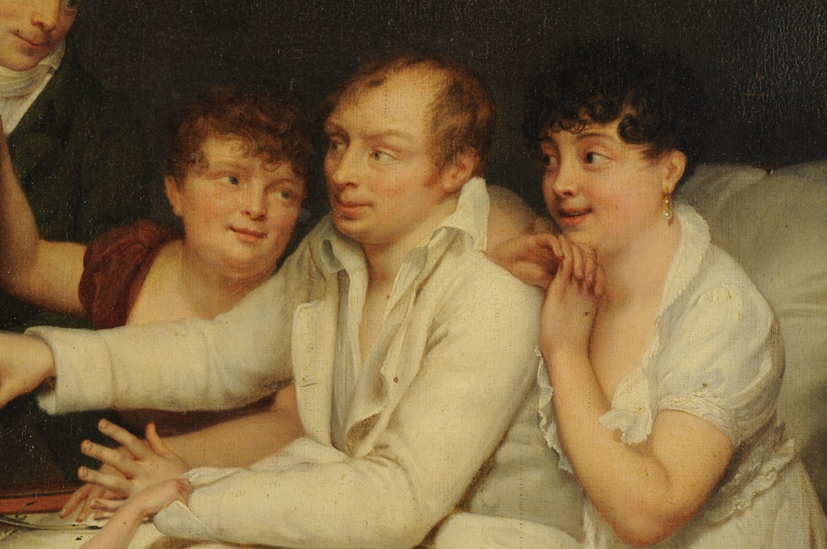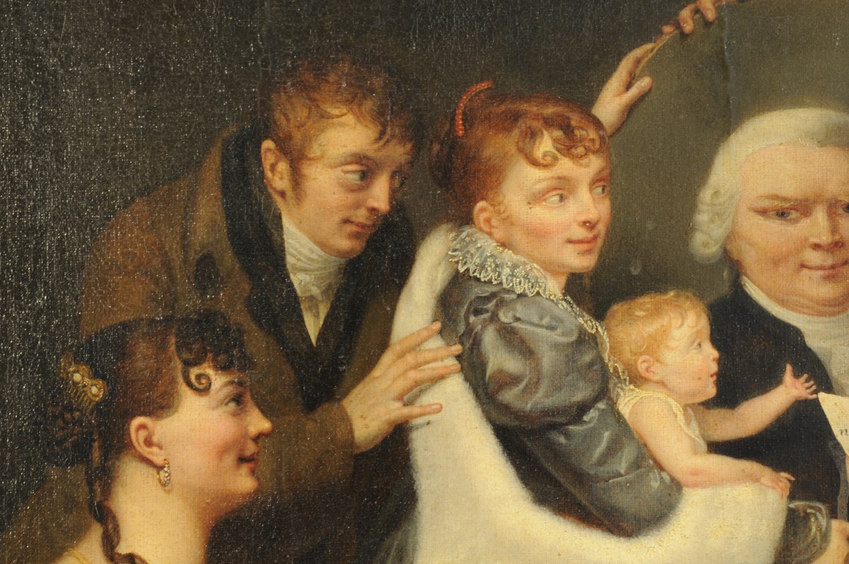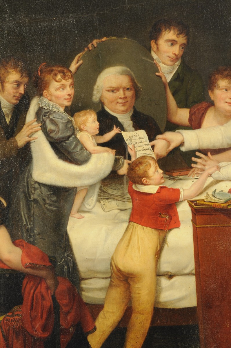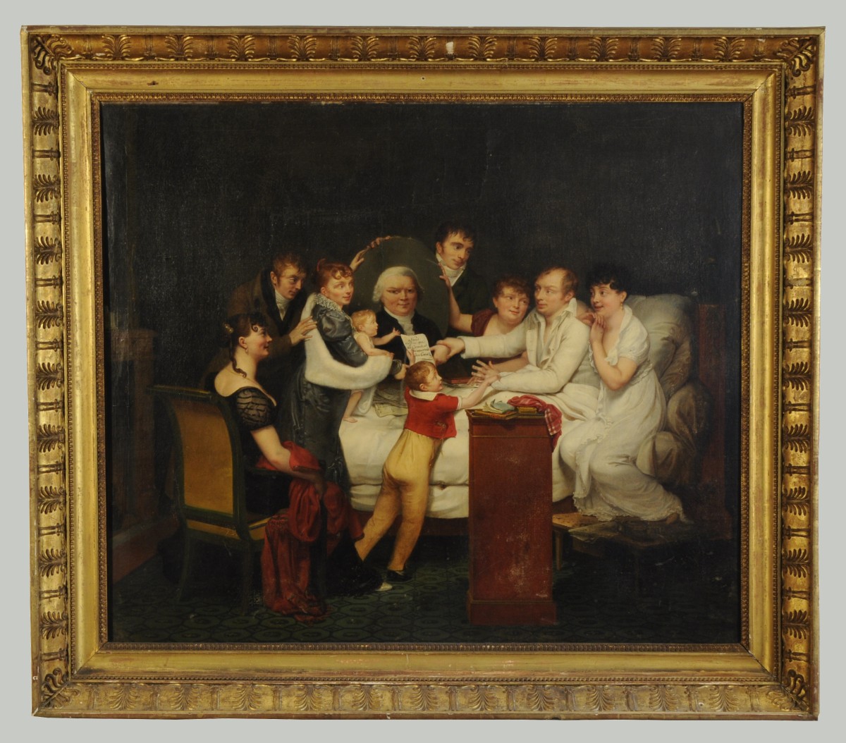 Ce portrait de famille réunit symboliquement trois générations autour du dramaturge Louis-Benoit Picard (1769-1828). Comédien, poète, romancier, puis auteur dramatique, Picard est élu en 1807 à l'Académie Française où il est reçu par Bernardin de Saint-Pierre. Il dirige alors l'Académie impériale (puis royale) de musique avant de prendre la tête de l'Odéon, de 1816 à 1821. S'il est représenté en pied, debout, sur la façade arrière de l'Hôtel de Ville de Paris, on le trouve ici alité, en homme de lettres avec une table d'accouchée posée à ses pieds et une écritoire en acajou comme celle du Marat assassiné, de David. Des manuscrits de travail, un livre relié en cours de lecture, une plume, de l'encre et une tabatière composent l'immédiat du dramaturge. Assise contre lui, à l'extrême droite, se tient son épouse Victoria de Longchamps. De l'autre côté, à gauche, sa sur, Adèle Picard, et son frère Latour Picard. Ils lui offrent, avec leur autre sur, Madame Guersant, de l'autre côté, le portrait de leur père, par Pauline Auzou. Ce portrait de "Monsieur Picard Ainé, ancien avocat et parlementaire" a valu au salon de 1806 une médaille d'honneur au peintre. L'enfant en veste rouge, neveu de Picard, légende cette scène d'un compliment: "Nous n'offrons que ses Traits et tu nous rends son Cur". Cet enfant est le futur médecin Paul Louis Benoît Guersant (1800-1869), frère du bébé debout sur le lit, Madame Blache, par la descendance de laquelle ce tableau a été conservé. Madame Guersant, sur de Louis-Benoit Picard, en robe bleue et hermine, tient d'un côté sa fille dans les bras et de l'autre le portrait de son père. Son mari pose sur son épaule une main protectrice. Il s'agit du docteur Louis-Benoit Guersant (1777-1848), qui se fit connaitre par ses travaux sur les maladies de l'enfance. En 1813, il vint à bout d'une épidémie de typhus qui tuait des enfants par centaines en Bourgogne. Sous la Monarchie de Juillet il est le médecin des enfants royaux. La belle sur de Picard, épouse de Latour Picard, est assise à l'extrême gauche en robe noire et châle rouge. Les murs sombres et vides mettent en valeur chacun des personnages. La petite cheminée en marbre à gauche, le tapis à alvéoles vert en bas, et le montant du lit en acajou surmonté d'une figure féminine en ébène marquent un intérieur raffiné et discret. La composition rayonne autour du portrait de Picard l'ainé, mais les regards joyeux sont tournés vers celui à qui en est fait le présent, jour de sa fête, à la Saint-Louis. Pauline Auzou immortalise brillamment la réception d'une de ses toiles dans la confiance et l'intimité de la famille commanditaire, mêlant scène de genre et art du portrait.
