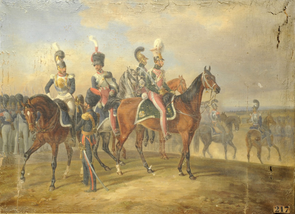 Cette toile représente une revue militaire avec, au premier plan, des soldats de la Garde Royale du Roi Louis XVIII. De gauche à droite on distingue un cuirassier, un artilleur à cheval, un hussard, un dragon et enfin un chevau-léger.
