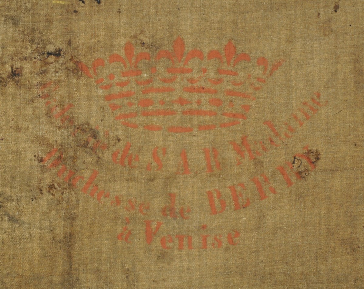 - collection Duchesse de Berry. Tampon au verso de la toile en lettres rouges sommées d'une couronne: " Galerie de S A R Madame Duchesse de Berry à Venise "