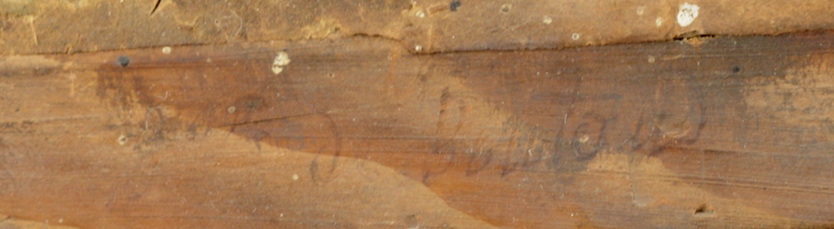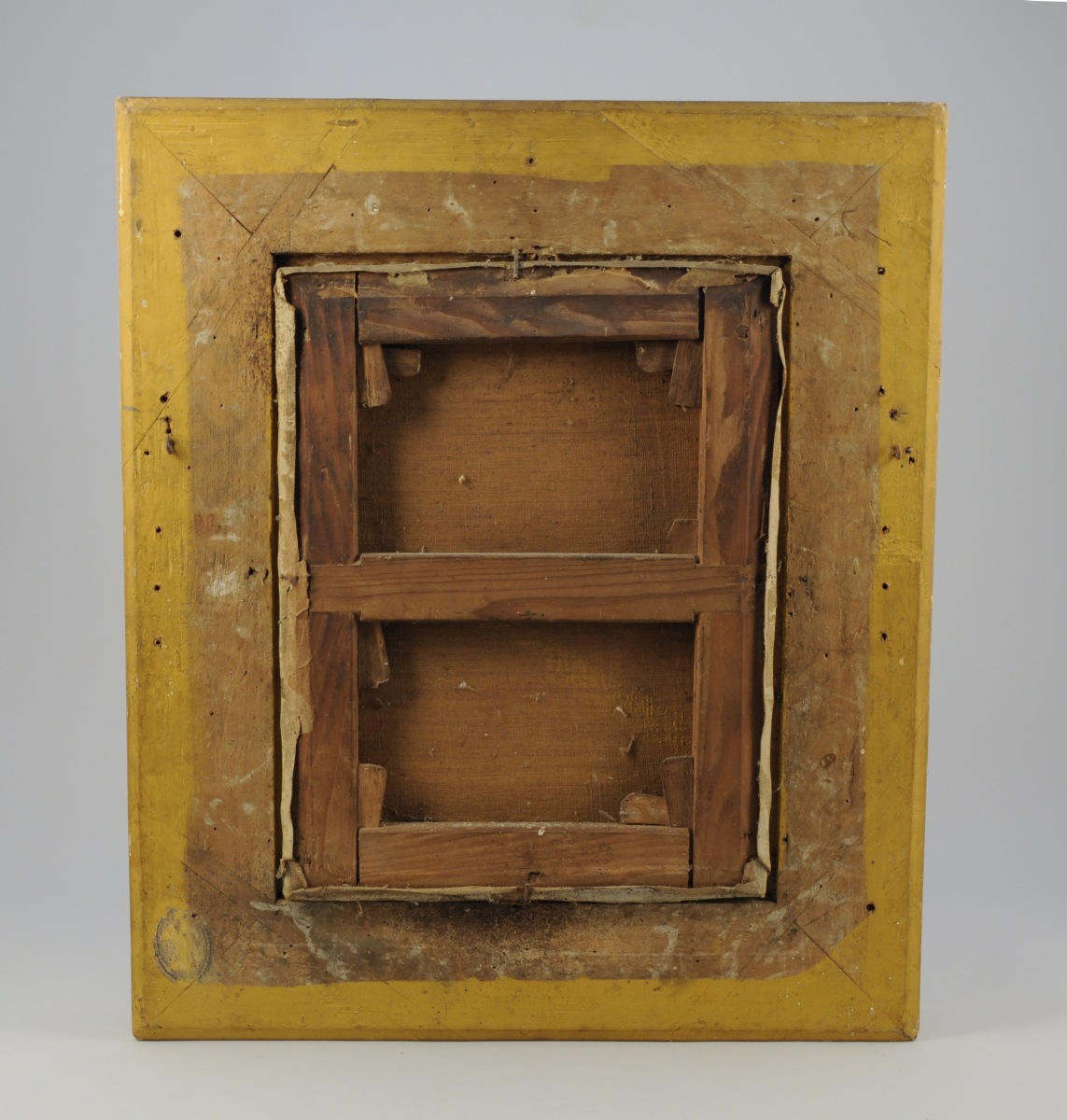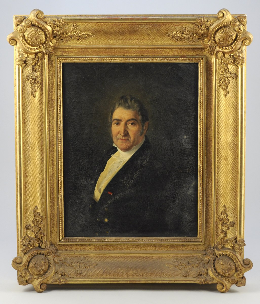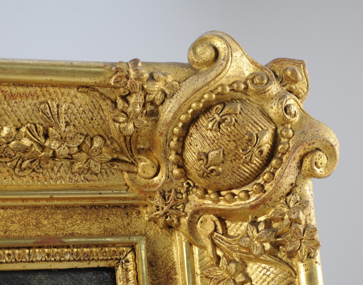 Dans un cadre en bois sculpté et doré aux armes de France.