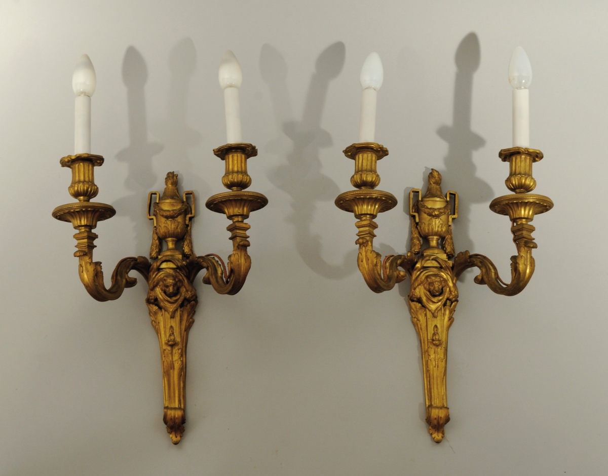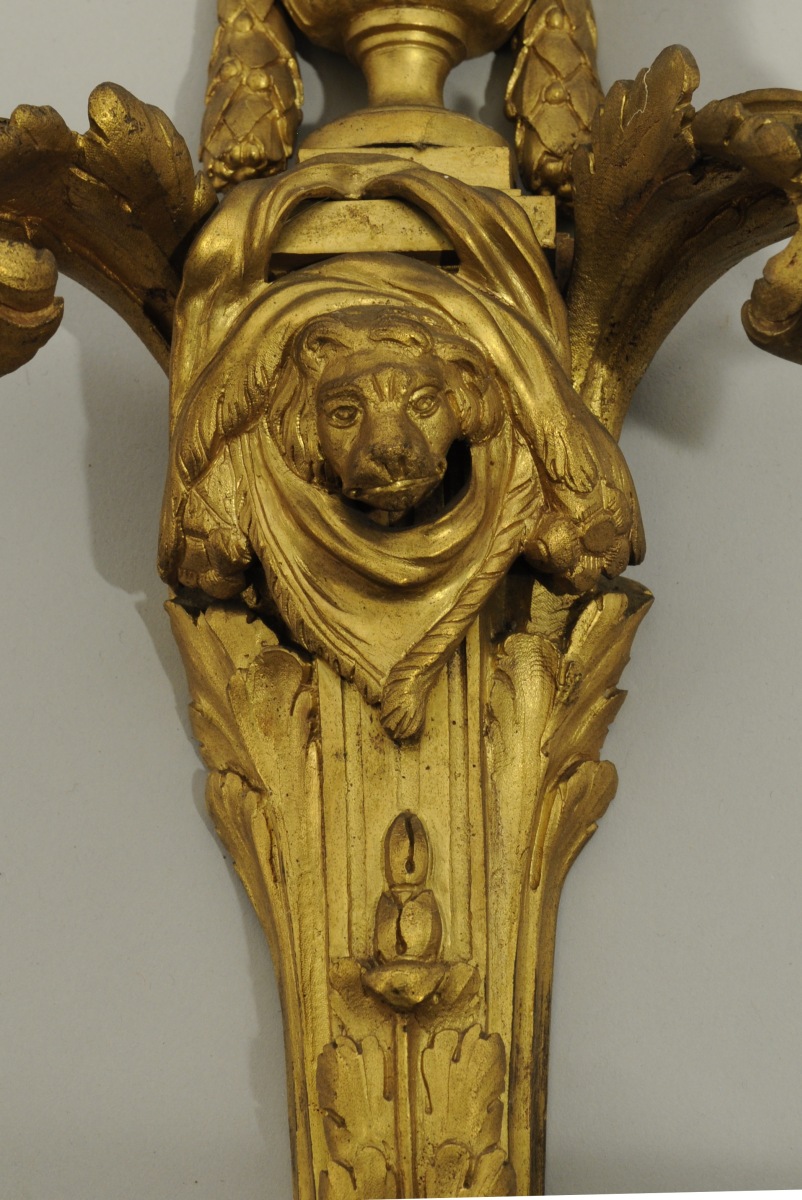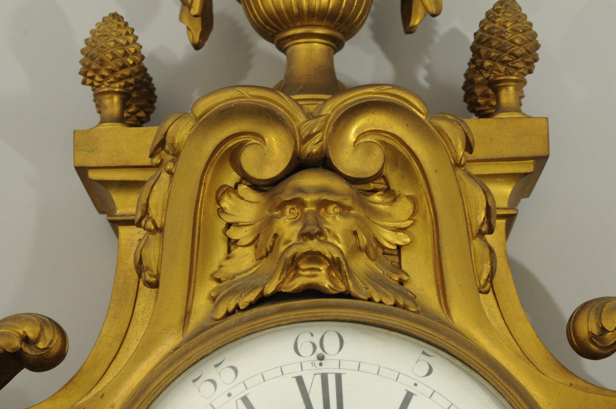 GARNITURE DE STYLE LOUIS XV en bronze doré comprenant un cartel d'applique et deux flambeaux à deux bras de lumière. Cartel violoné mouluré et orné de rinceaux, feuilles d'acanthe, tore de laurier noué et frise de feuilles d'eau, sur fond ajouré de croisillons. Cadran émaillé en chiffres romains et minutes en chiffres arabes, aiguilles ciselées et ajourées, surmonté d'un mascaron phytomorphe. Le tout surmonté d'une urne à mascarons féminins et de pommes de pin. Les flambeaux en gaine feuillagée surmontée d'un pot de feu et de tores de laurier. À la naissance des bras de lumière moulurés et feuillagés, une tête de lion. Binets godronnés.
