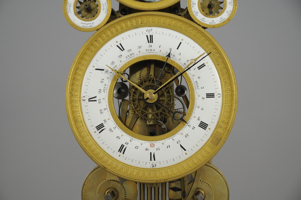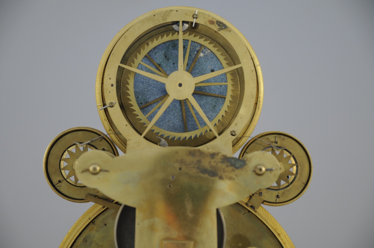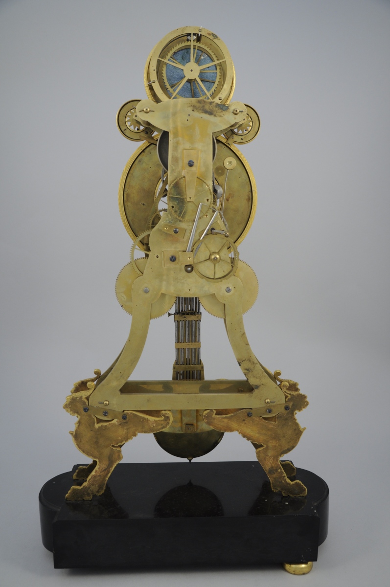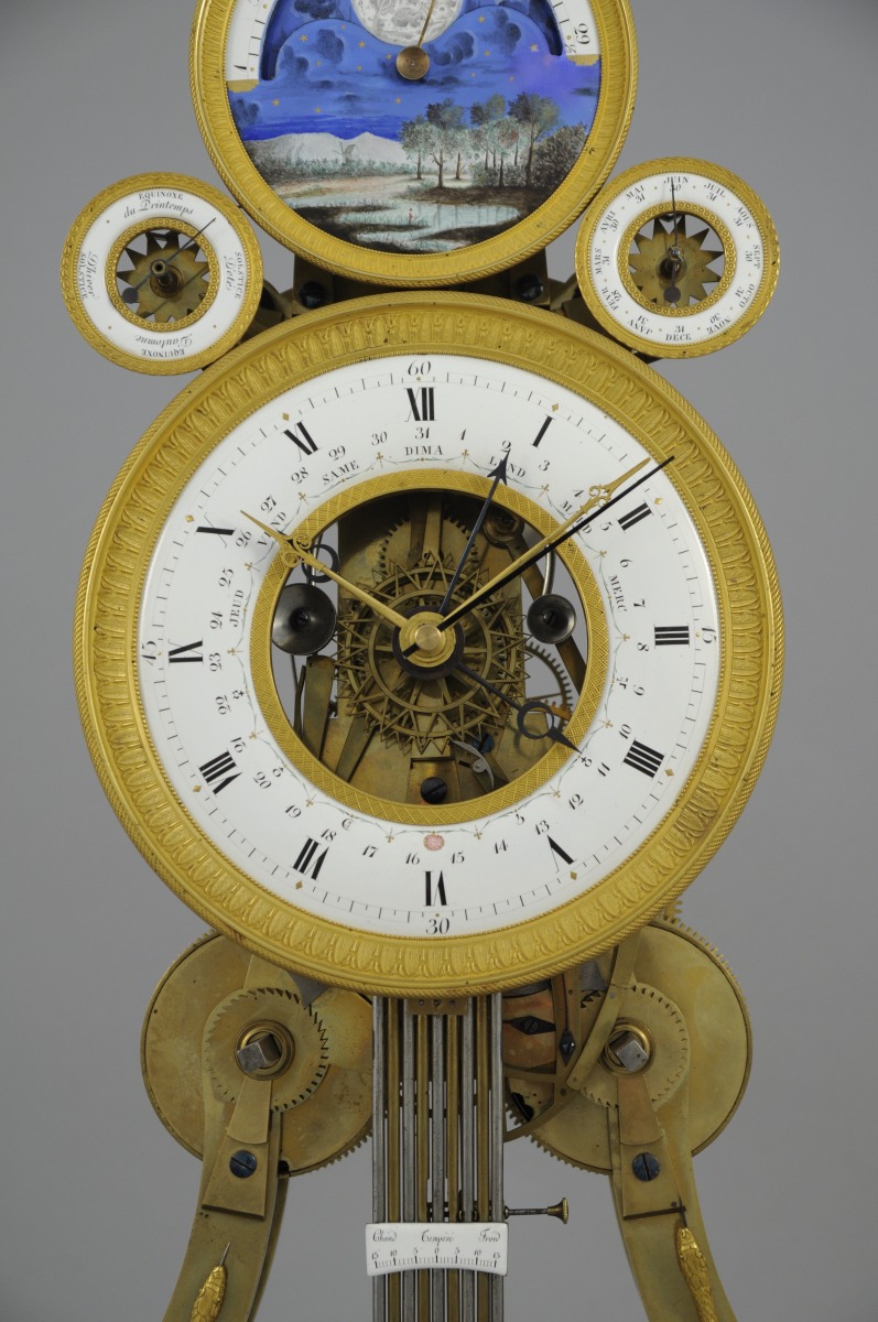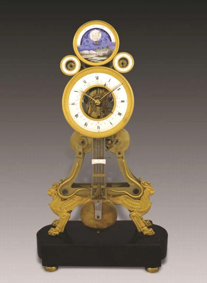 L'engouement pour les pendules squelettes apparaît dans la dernière décennie du XVIIIème siècle. Il procède du double mouvement de l'admiration pour les progrès technique et d'une volonté d'épure esthétique. Le rejet des pendules à sujets ornées de figures mythologiques trouve un écho dans la découverte de la beauté et de la complexité des mécanismes horlogers, avec leurs fines tiges et rouages, auxquels le roi Louis XVI lui même était sensible. Enfin, la pénurie de matières premières, liée aux troubles révolutionnaire, puis aux campagnes napoléoniennes, oblige les créateurs à concevoir des structures dépouillées de toute ornementation superflue. Ici, seuls les quatre profils de griffons en bronzes finement ciselés et dorés, et le cadran délicatement peint des phases de la lune, viennent en ornementation. Associé à de nombreuses divinités pendant l'antiquité, le griffon est réputé vivre dans un désert riche en or, dont il fait son nid. Il détiendrait la force de cent aigles ou de huit lions. Associé au serpent, ils se fait gardien farouche, du temps et de l'activité des hommes influencé par la Lune. Même non signés, les quatre cadrans émaillés de notre pendule, son balancier compensé de régulateur et la fonction de baromètre sont la marque d'un des horlogers les plus rares. Si des pendules signées de Boucher, de Ridel ou de Paratte, aux cadrans décorés pas Cotteau, sont déjà passées en vente publique, elles ne comportaient pas autant de combinaisons que la notre. L'anonymat de l'horloger n'est pas atypique. Ainsi, un modèle comparable, également anonyme, avec quatre cadrans mais sans fonction baromètre, d'époque et de style Louis XVI, est conservé dans les collections royales espagnoles.