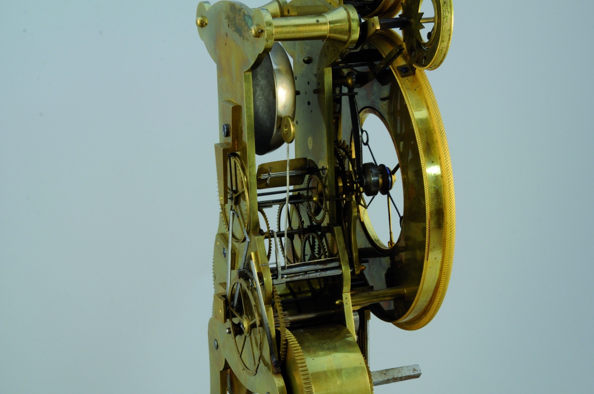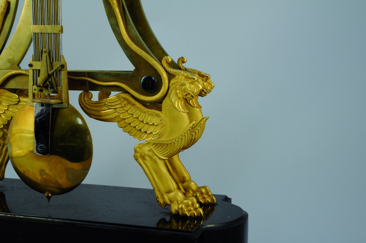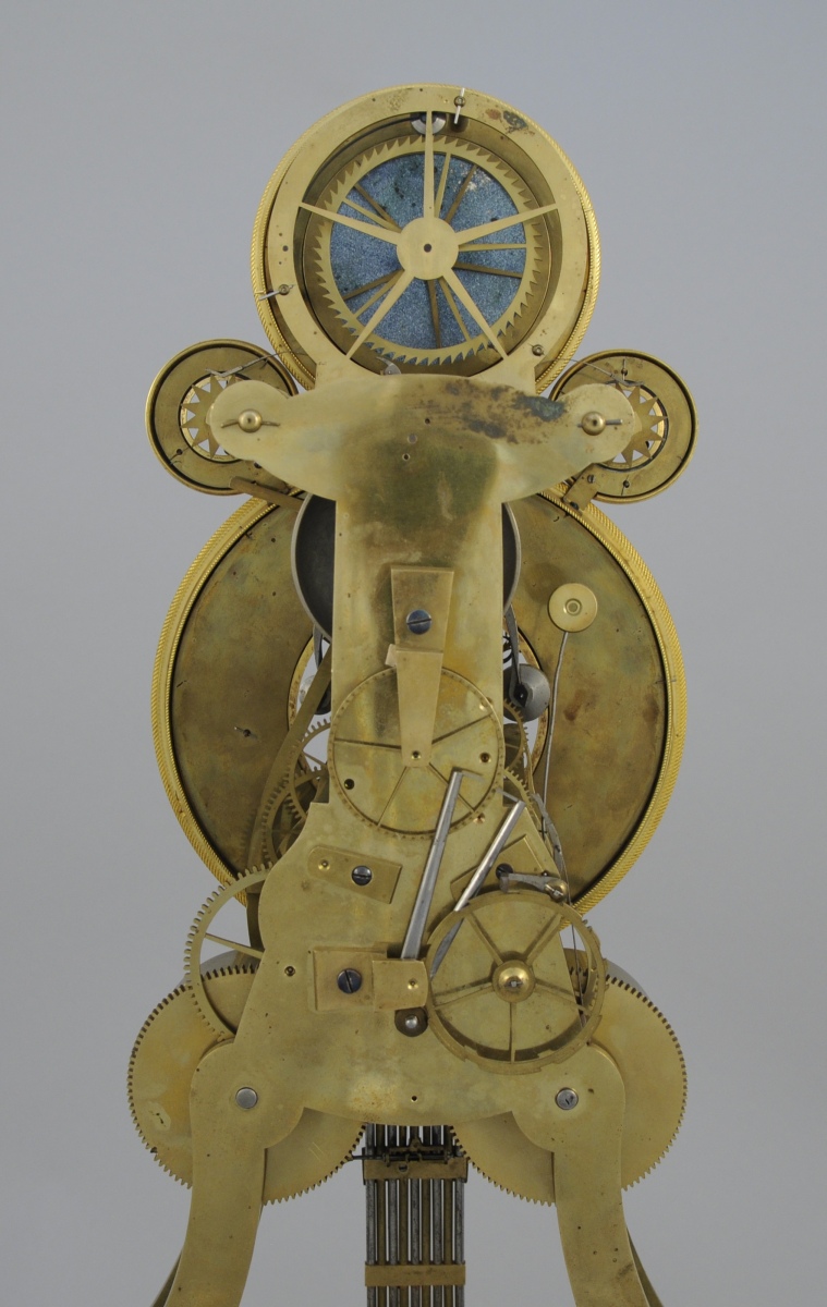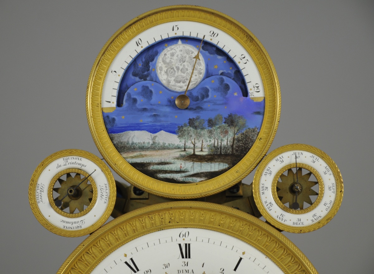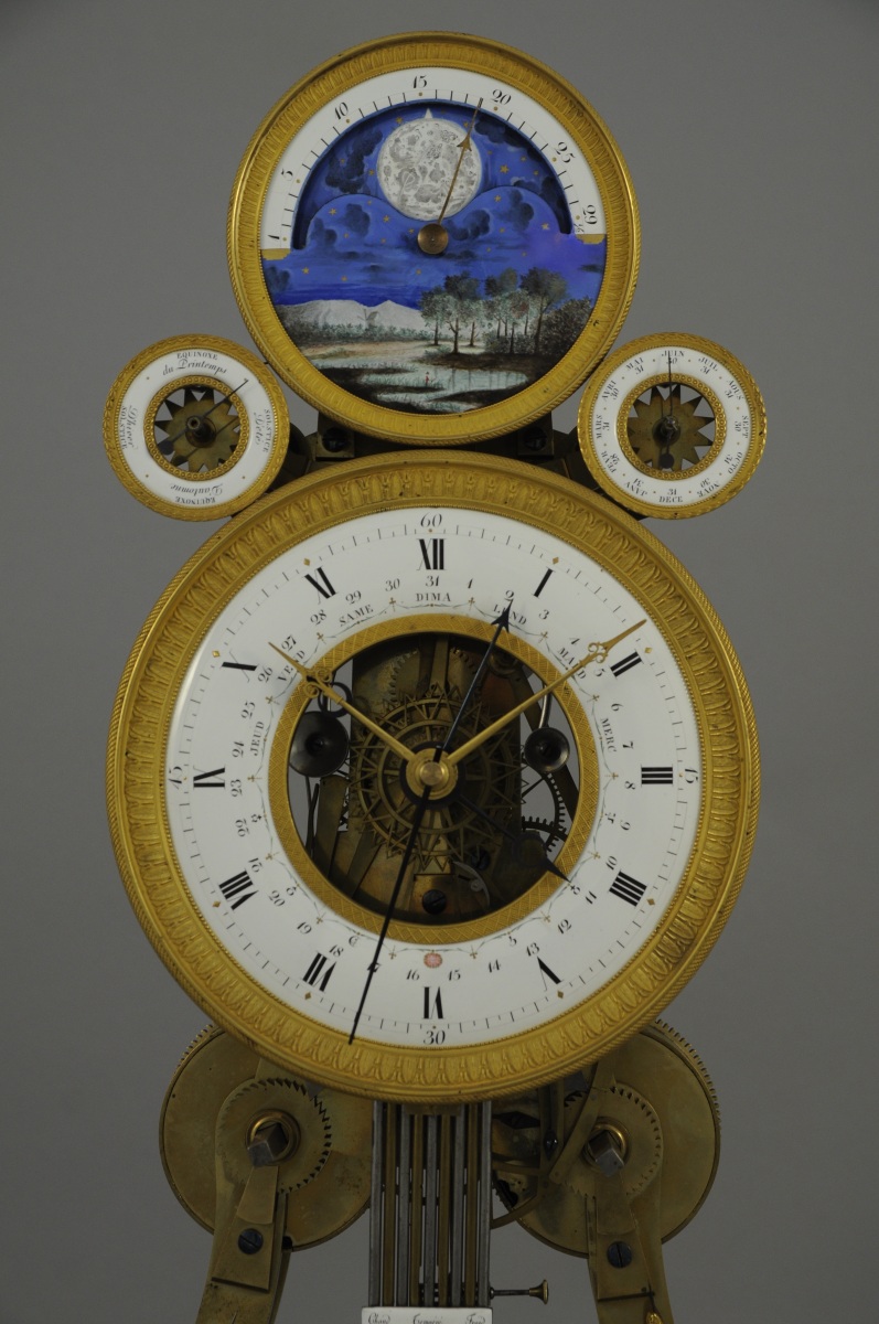 L'engouement pour les pendules squelettes apparaît dans la dernière décennie du XVIIIème siècle. Il procède du double mouvement de l'admiration pour les progrès technique et d'une volonté d'épure esthétique. Le rejet des pendules à sujets ornées de figures mythologiques trouve un écho dans la découverte de la beauté et de la complexité des mécanismes horlogers, avec leurs fines tiges et rouages, auxquels le roi Louis XVI lui même était sensible. Enfin, la pénurie de matières premières, liée aux troubles révolutionnaire, puis aux campagnes napoléoniennes, oblige les créateurs à concevoir des structures dépouillées de toute ornementation superflue. Ici, seuls les quatre profils de griffons en bronzes finement ciselés et dorés, et le cadran délicatement peint des phases de la lune, viennent en ornementation. Associé à de nombreuses divinités pendant l'antiquité, le griffon est réputé vivre dans un désert riche en or, dont il fait son nid. Il détiendrait la force de cent aigles ou de huit lions. Associé au serpent, ils se fait gardien farouche, du temps et de l'activité des hommes influencé par la Lune. Même non signés, les quatre cadrans émaillés de notre pendule, son balancier compensé de régulateur et la fonction de baromètre sont la marque d'un des horlogers les plus rares. Si des pendules signées de Boucher, de Ridel ou de Paratte, aux cadrans décorés pas Cotteau, sont déjà passées en vente publique, elles ne comportaient pas autant de combinaisons que la notre. L'anonymat de l'horloger n'est pas atypique. Ainsi, un modèle comparable, également anonyme, avec quatre cadrans mais sans fonction baromètre, d'époque et de style Louis XVI, est conservé dans les collections royales espagnoles.