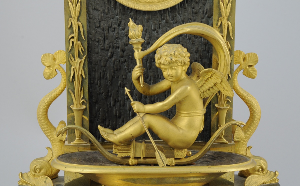 PENDULE en bronze ciselé, patiné et doré figurant l'Amour, assis sur son arc et son carquois, voguant dans un bassin. D'une main, il pagaie avec une flèche et, de l'autre, il brandit un flambeau drapé. La cage, de forme architecturée, présente un fond simulant la paroi d'une grotte encadrée de pilastres ornés de roseaux et de coquilles. Deux dauphins la soutiennent. La terrasse est agrémentée de masques de vieillard et du dieu Poséidon brandissant son trident.
