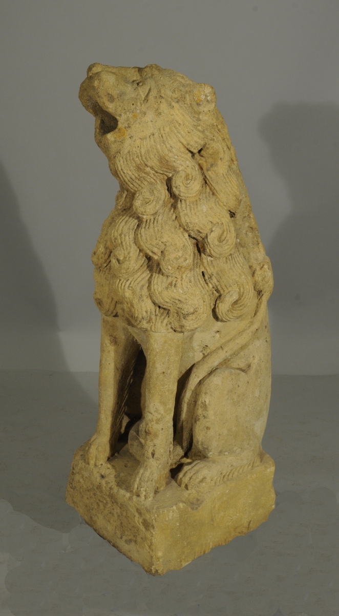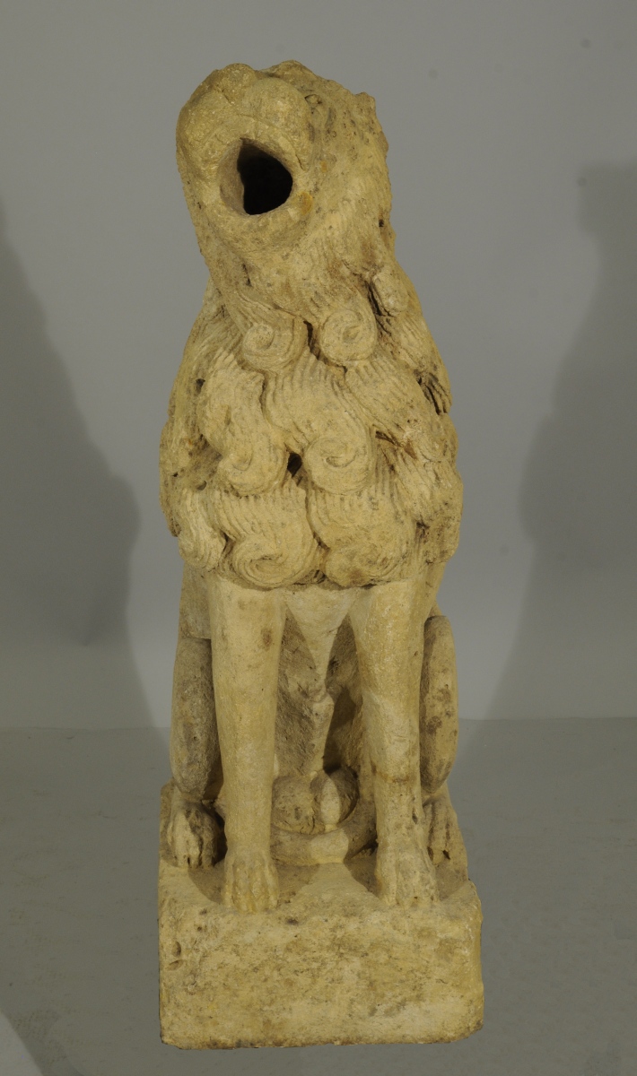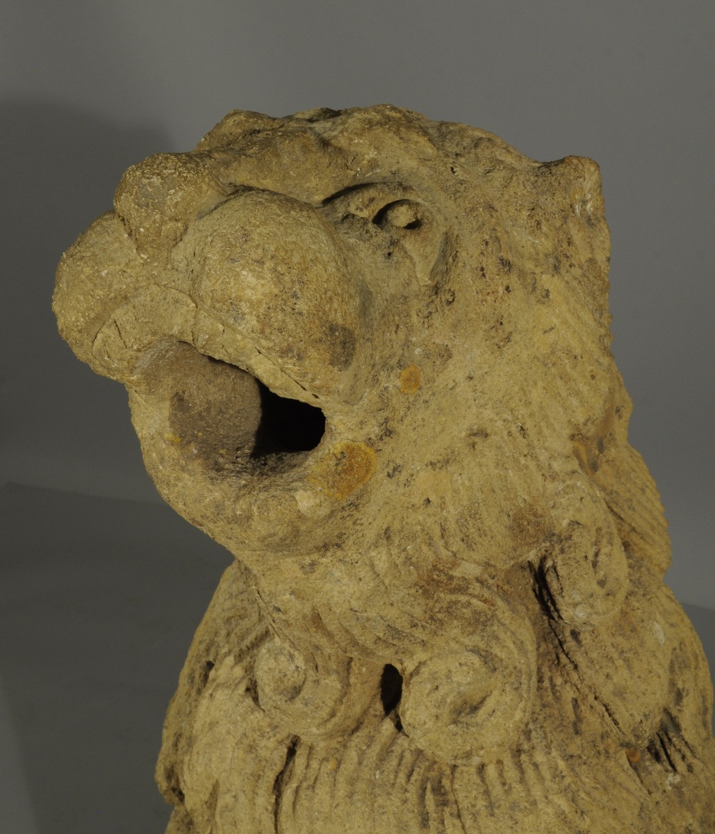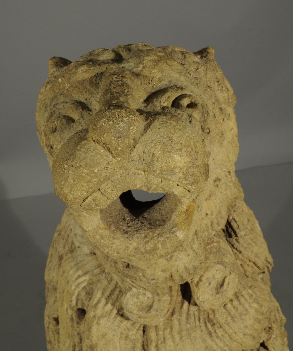 Le musée du Louvre conserve un lion comparable, du second quart du XIVème siècle provenant de la Cathédrale Saint-Pierre et Saint-Paul à Troyes (RF910). Notre paire de gargouilles est réputée avoir fait partie des collections du château de Loubresac dans le Lot. Fortifié par des remparts au XIVème siècle sur un promontoir rocheux surplombant la Dordogne par le Baron Adhémar d'Aigrefeuille, le manoir actuel remonte au XVème siècle. L'église Saint Jean-Baptiste de Loubressac abrite, dans une chapelle du 13ème siècle, un Christ en majesté, et des lions en marbre rose, d'origine carolingienne. Dans la symbolique chrétienne, la complexité fondamentale de l'homme, corps et âme, est symbolisée par l'association de l'oiseau et du lion. Grâce à leurs ailes, les oiseaux s'élèvent au-dessus des vicissitudes strictement terrestres évoquant la quête de spiritualité, alors que l'animalité humaine est évoquée par l'image du lion.