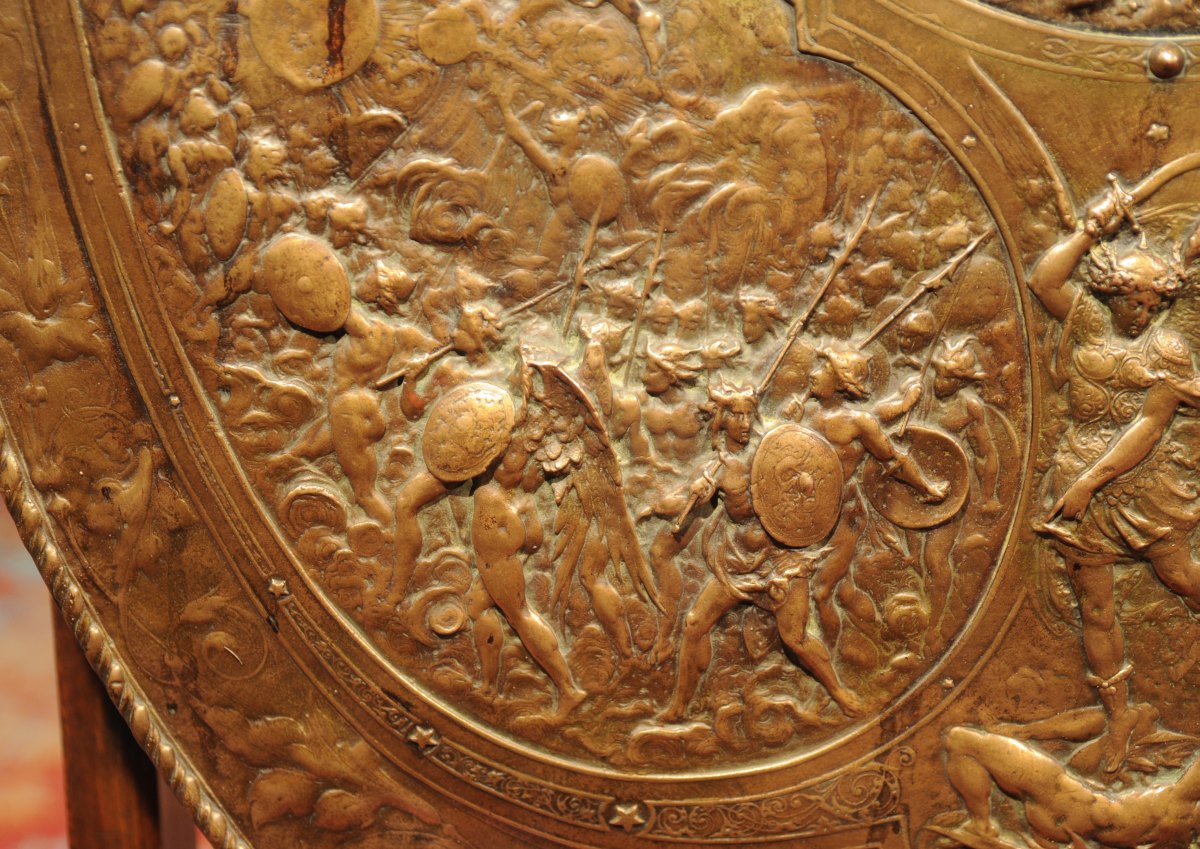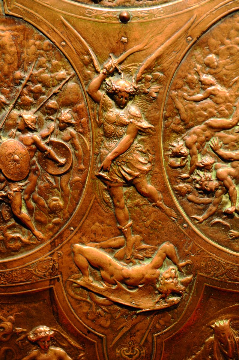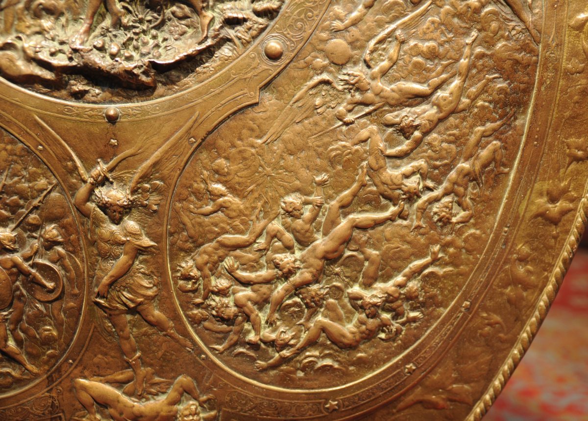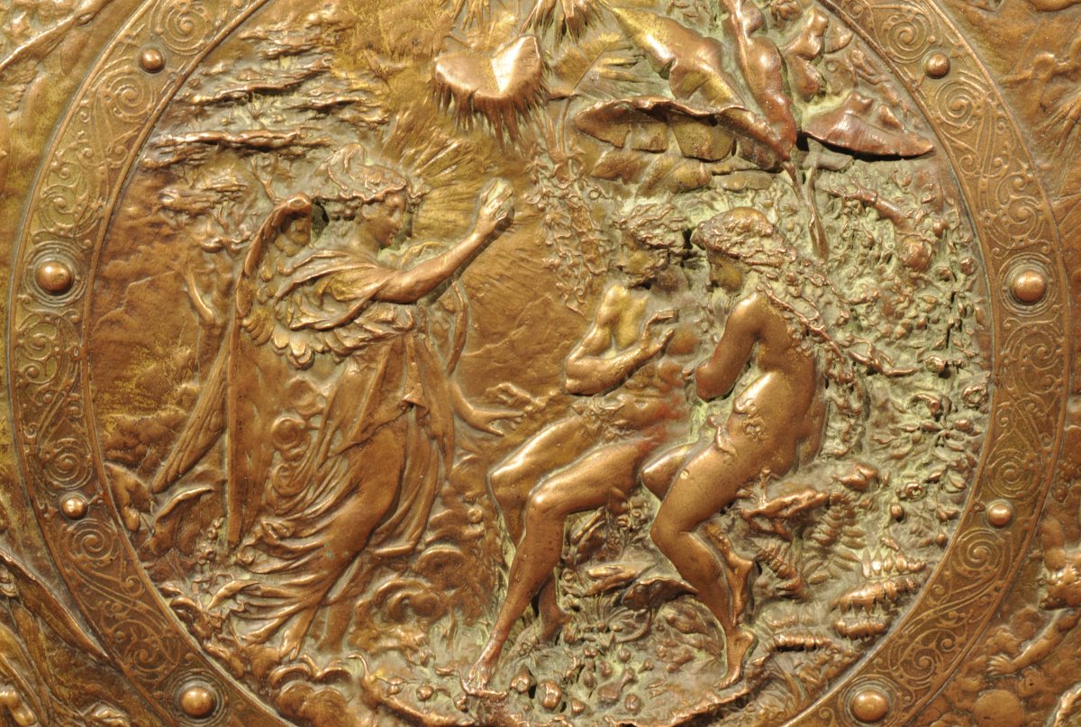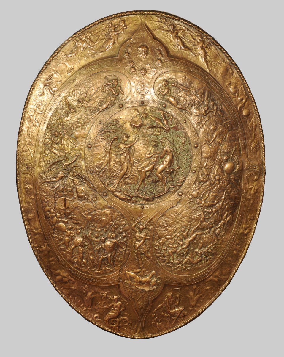 Bouclier d'ornement, dit de Milton, sur le thème du Paradis Perdu, réalisé par la Maison britannique Elkington (Birmingham, Royaume-Uni, entre 1824 et 1968). Ce bouclier forme une paire avec le bouclier d'ornement dit "de Bunyan". L'original en argent a été présenté à l'Exposition universelle de 1867 à Paris. Cette oeuvre qui a fait sensation a été achetée 3.000 £ par le gouvernement britannique, alors que des copies en galvanoplastie étaient éditées. L'original est, depuis, conservé au Victoria & Albert Museum. Le Musée d'Orsay à Paris a acquis une édition en galvanoplastie, en 2009, qu'il conserve sous le numéro d'inventaire OAO 1773 1.
