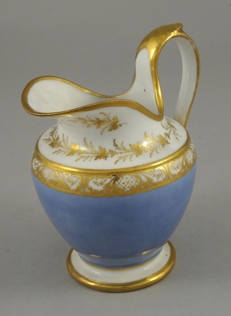 PARTIE DE SERVICE à fond bleu poudré. Décor circulaire or sur fond blanc de feuillages stylisés, volutes et quadrillages. Il comprend une THÉIÈRE couverte de forme cylindrique et un pot à lait pansu.