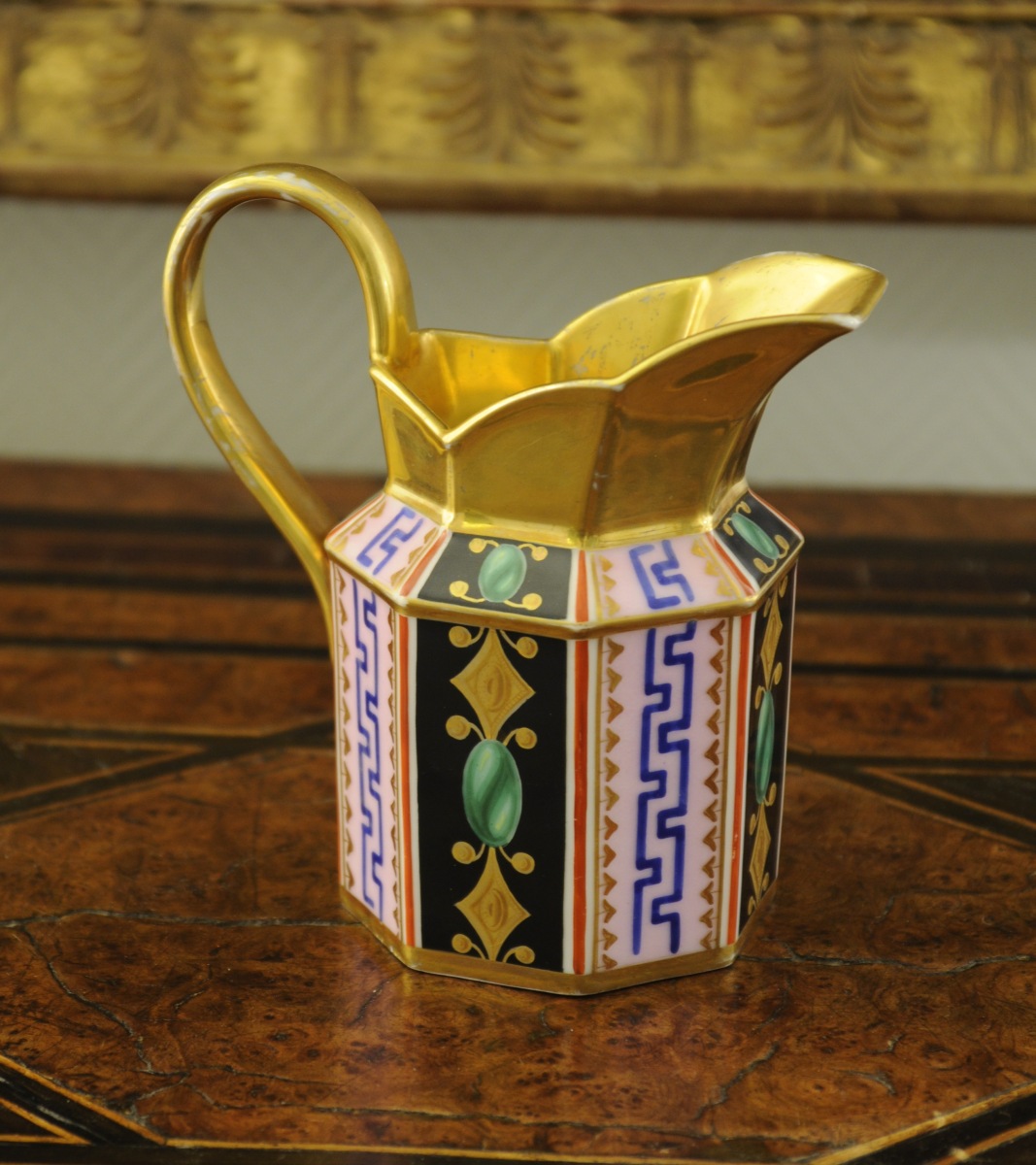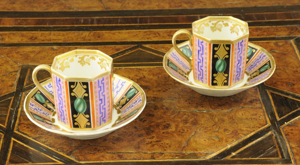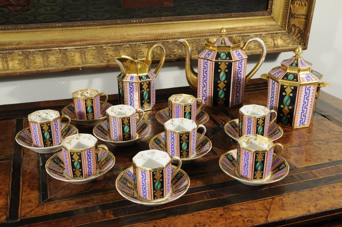 SERVICE À CAFÉ de douze pièces comprenant un pot à lait, une verseuse, un sucrier, neuf tasses et sous-tasses en porcelaine à décor polychrome à l'étrusque de frises géométriques et d'émeraudes montées en cabochon et rehaussé à l'or. Marques olographes: "Cassé Maillard 19 bd des Italiens Paris".