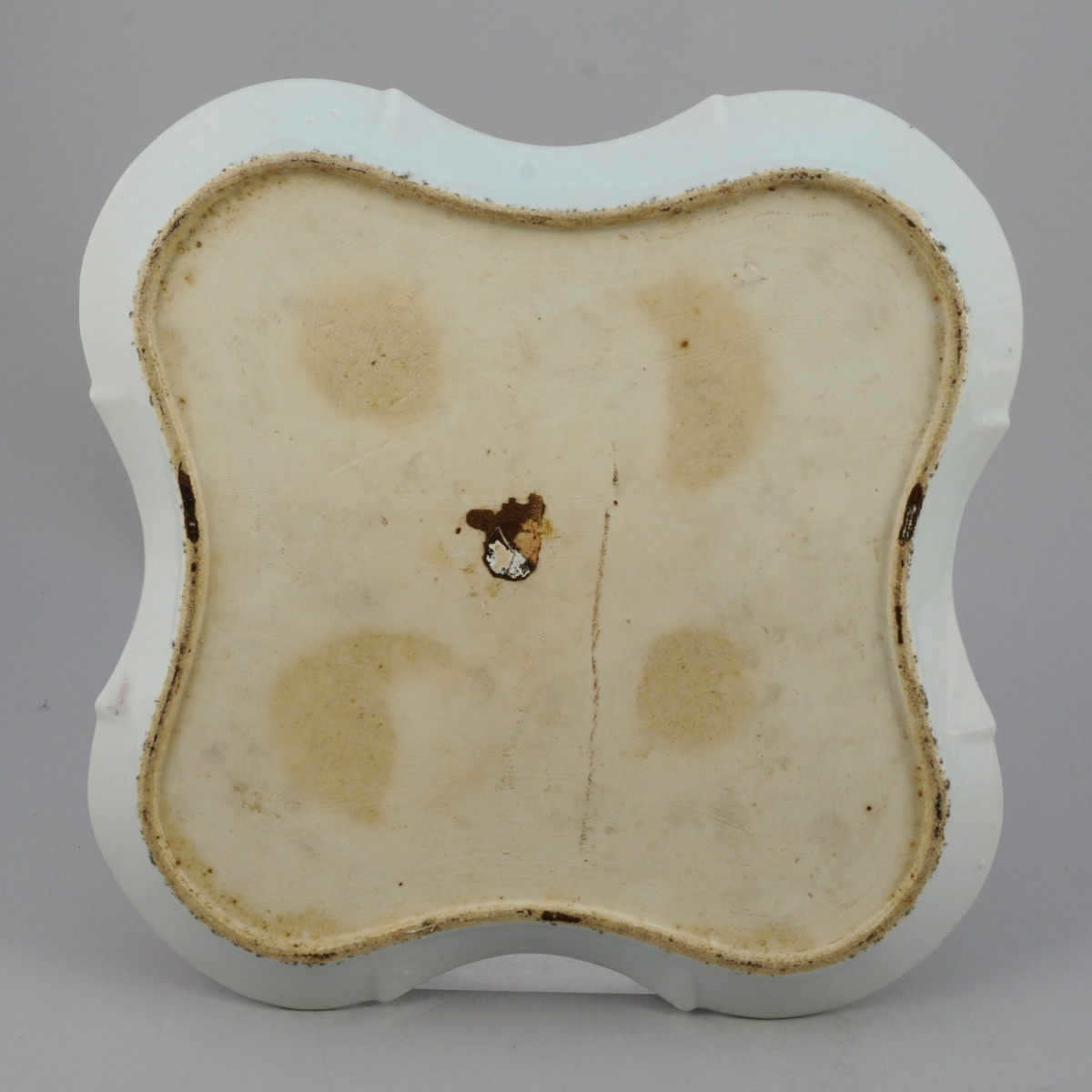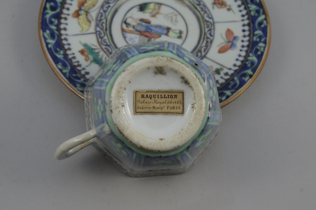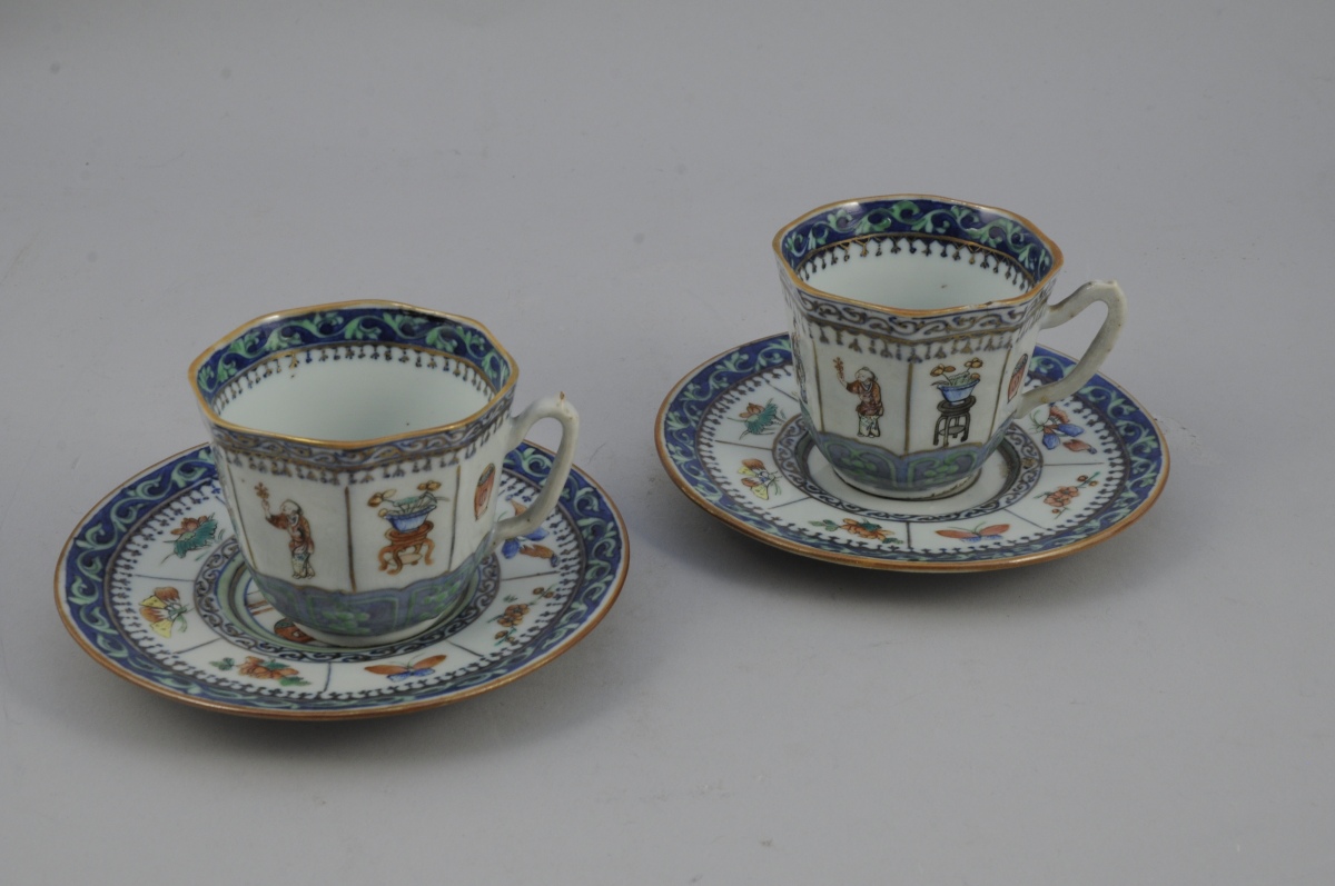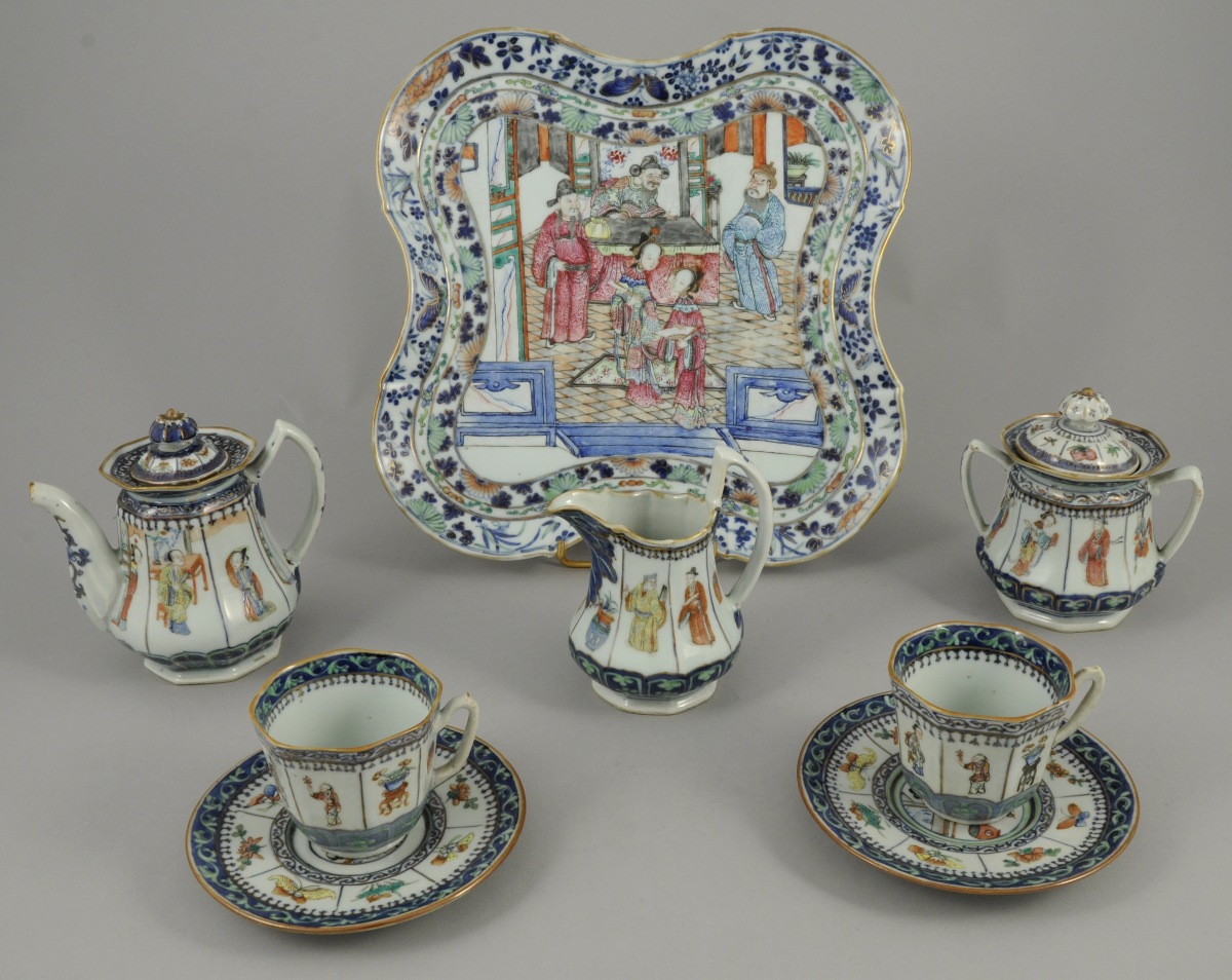 SERVICE à THÉ "tête à tête" en porcelaine comprenant une théière, un sucrier, un pot à lait, un plateau, deux tasses et deux sous-tasses. La théière, le sucrier, le pot à lait et les tasses de forme octogonale. plateau quadrilobé. Décor polychrome à dominante bleue de scènes de palais. Fleurs, insectes et feuillages sur les bords.