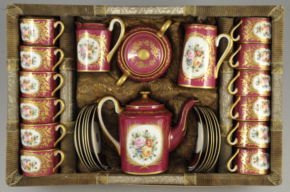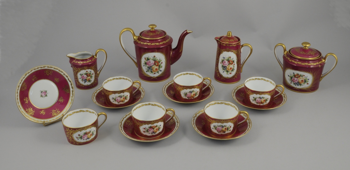SAMSON. SERVICE à chocolat en porcelaine comprenant une chocolatière, une verseuse, un pot à lait, un sucrier, douze tasses et leurs sous-tasses. Décor polychrome de bouquets de fleurs dans des cartouches de style Louis XV cernés de rinceaux or, se détachant sur un fond pourpre.