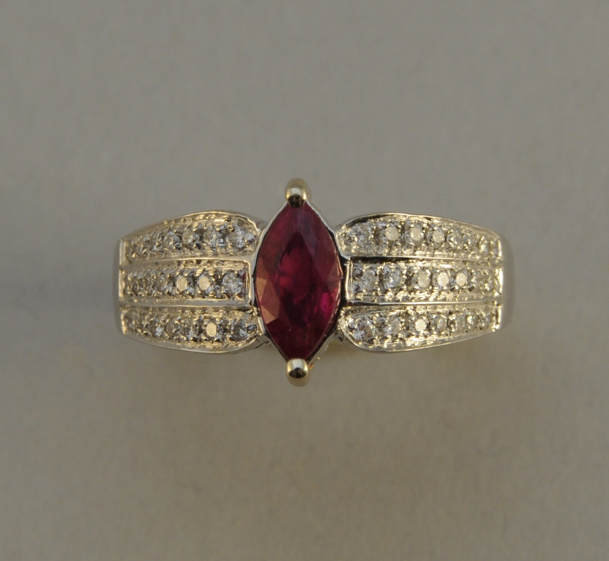 BAGUE en or blanc centrée d'un rubis de taille navette probablement birman en serti clos. Elle est agrémentée de 62 diamants de taille moderne de 0,50 carat environ.