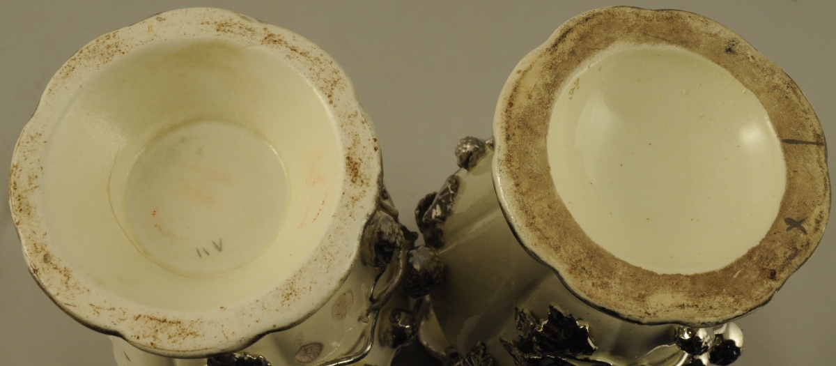 LANGEAIS. DEUX VASES balustre formant paire en faïence fine à fond blanc crémeux. Anses en forme de rinceaux et décor de branches et de fruits relevé de lustre platine. Fin XIXème. Haut. 22, 5 et 23, Diam. 11 cm. (accidents)